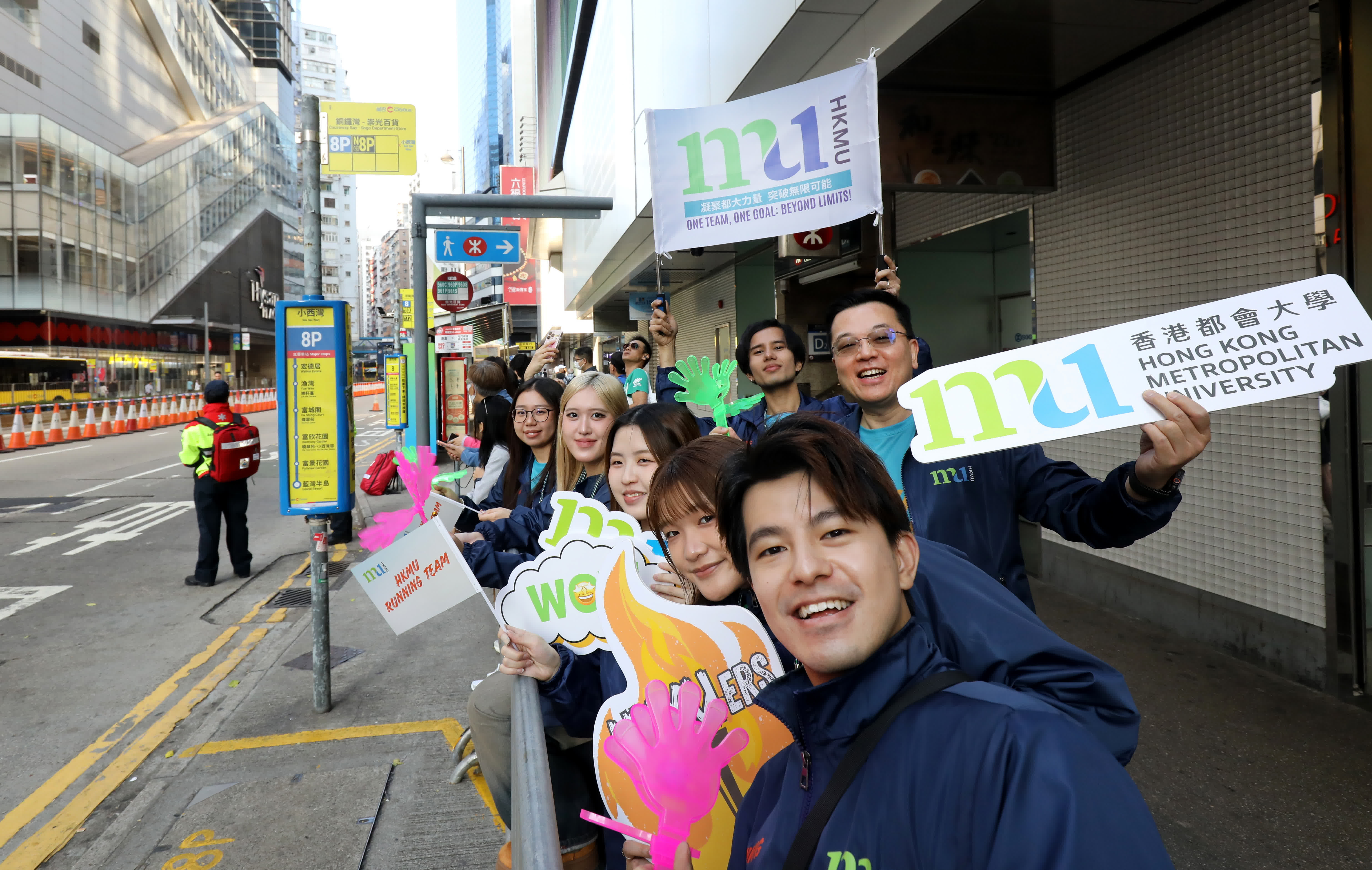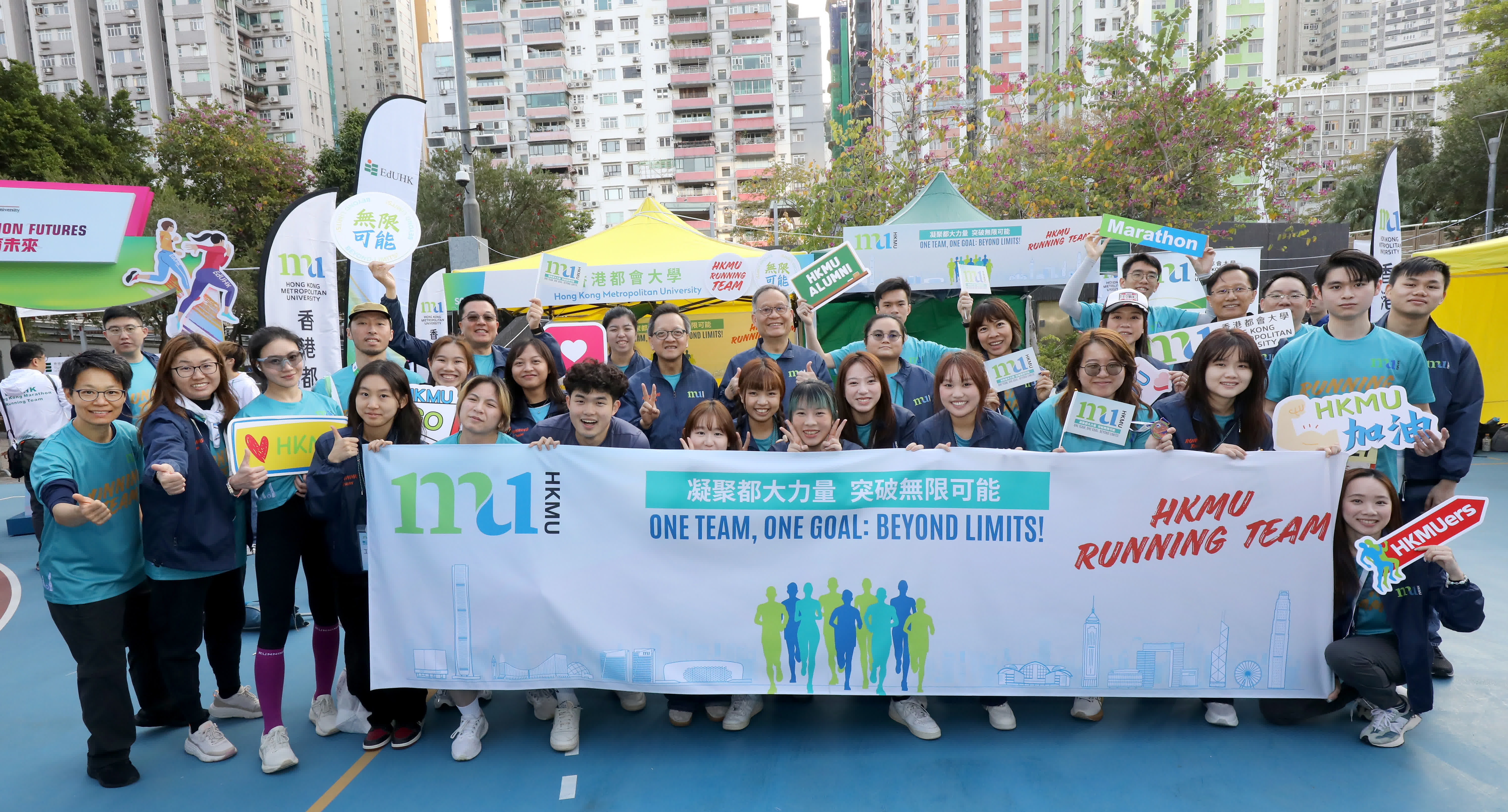 都大校長林群聲教授聯同副校長(行政及機構發展)鄺志良教授以及多位大學管理層成員,清晨到達維多利亞公園,為一眾都大健兒加油打氣,並在賽後恭賀完賽跑手,為他們送上補給品與能量飲品,以助恢復體力。