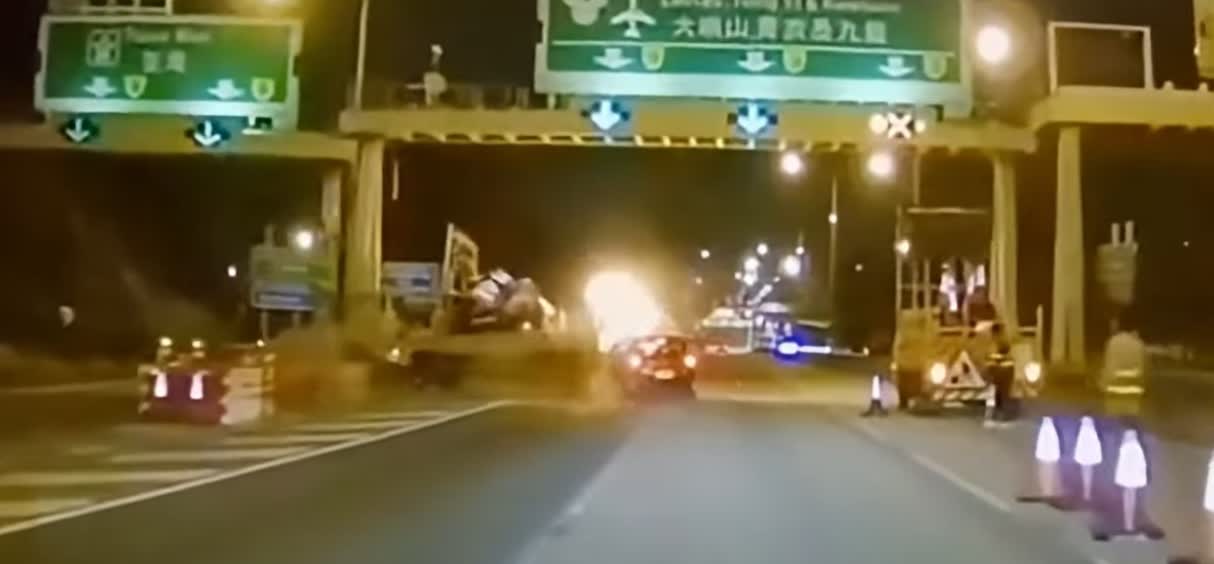 期間,工程車由快線切入中線時,尾隨一輛搭載4名乘客之的士,司機懷疑收掣不及,的士直撞向該工程車車尾。由於撞擊力頗大,工程車捱撞後向右翻側,一度冒出火光並橫亘路中,「雪糕筒」路障等散落一地。