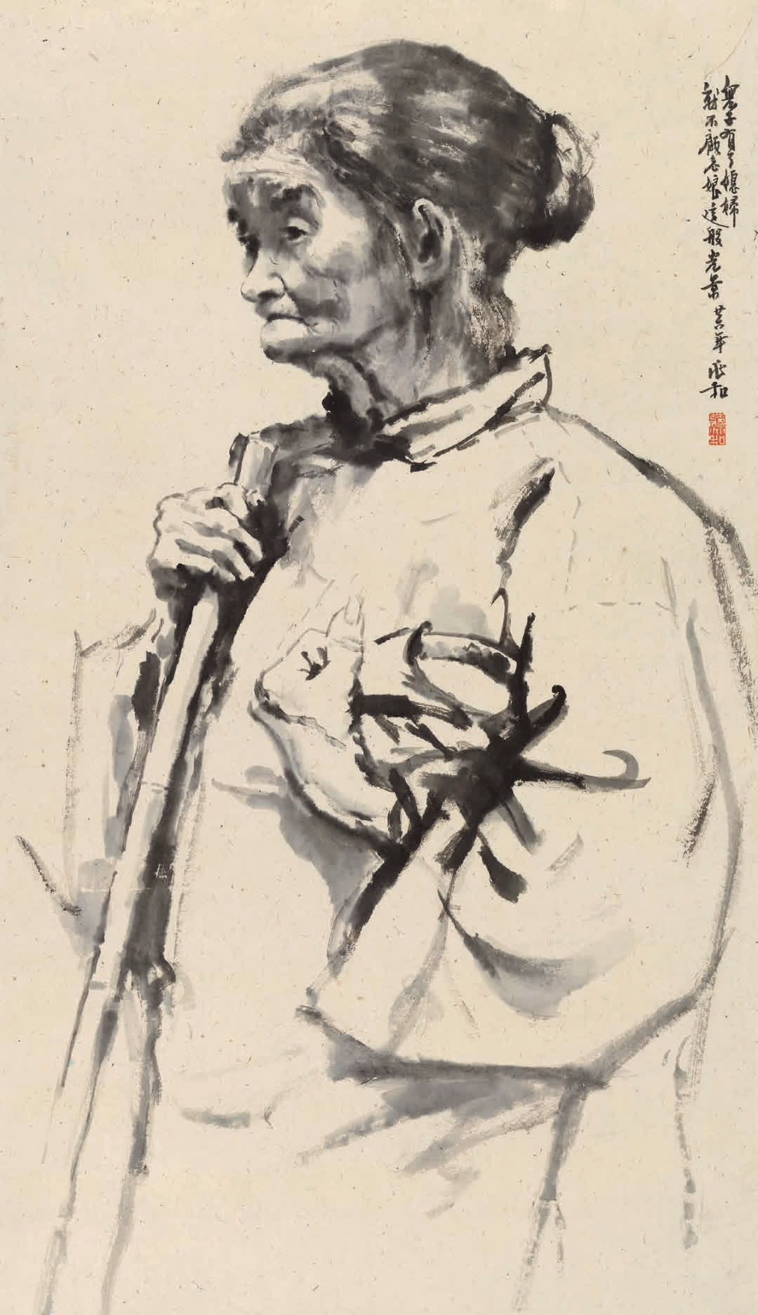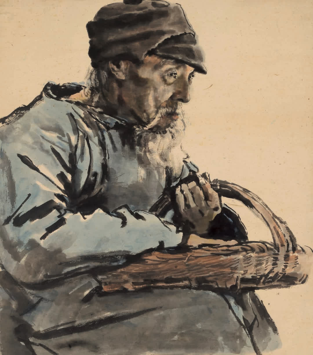 在形式語言的革新上,蔣兆和先生創造性地解決了中西融合的技術難題:他堅持以中國的紙、墨、筆為媒介,將西方嚴謹的素描造型與解剖知識,巧妙地轉化為水墨語言。他尤其創造性地將山水畫中表現山石質感的「皴擦」技法,運用於人物面部與衣袍的刻畫,以枯筆澀墨塑造出如雕塑般堅實、充滿歲月滄桑感的形體與肌理。這種「以中化西」的技法,不僅使水墨人物達到了前所未有的寫實深度,更使「形準」服務於「神真」,讓筆下每一個鮮活的生命都承載着時代的重量與個體的尊嚴。