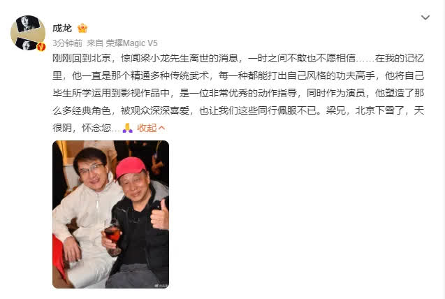 成龍在微博發文悼念:剛剛回到北京,驚聞梁小龍先生離世的消息,一時之間不敢也不願相信……在我的記憶裏,他一直是那個精通多種傳統武術,每一種都能打出自己風格的功夫高手,他將自己畢生所學運用到影視作品中,是一位非常優秀的動作指導,同時作為演員,他塑造了那麼多經典角色,被觀眾深深喜愛,也讓我們這些同行佩服不已。梁兄,北京下雪了,天很陰,懷念您…