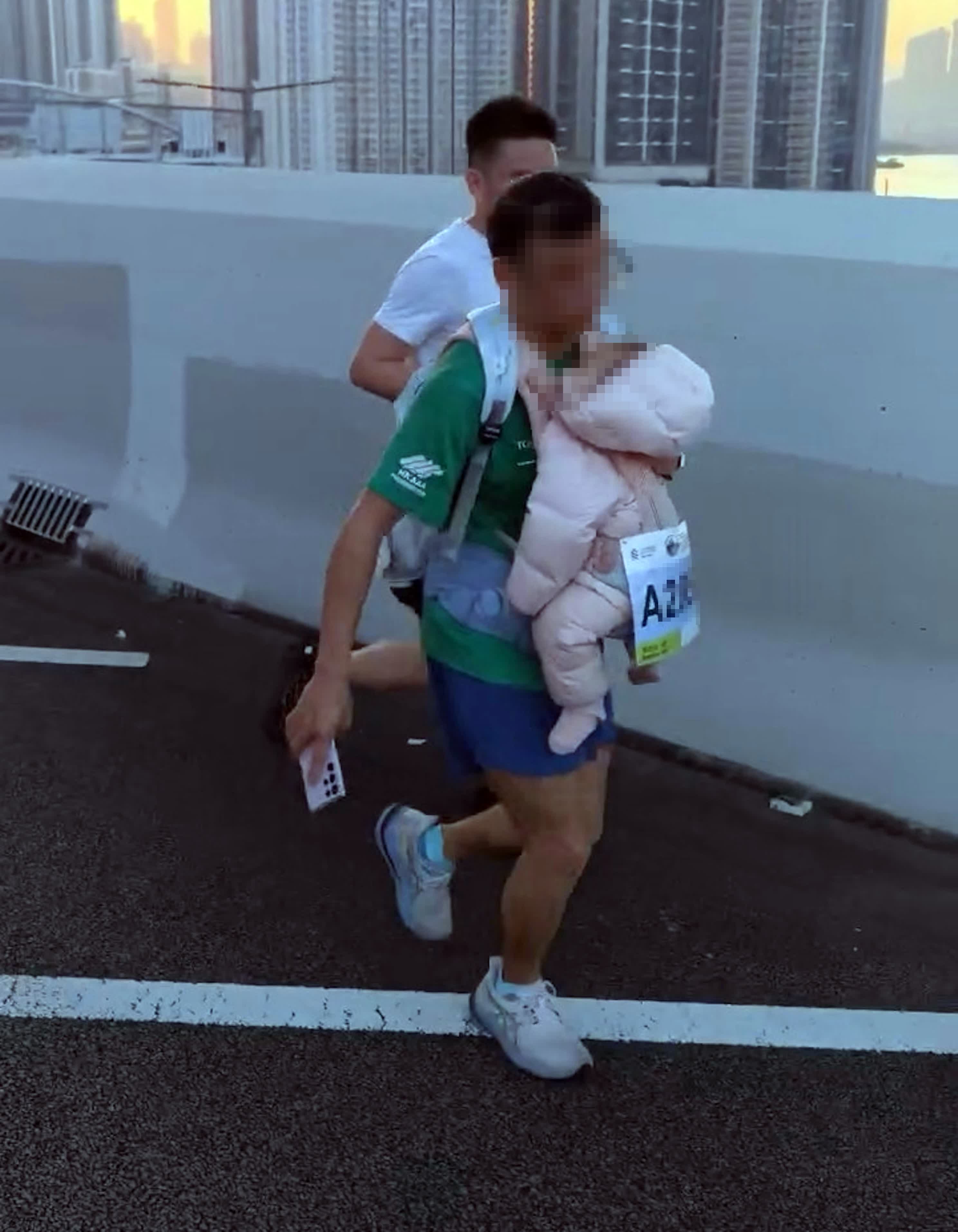 香港文匯報訊(記者 蕭景源)「渣打香港馬拉松2026」今日(18日)舉行,一如既往吸引不少跑手在賽場上扮鬼扮馬,為賽事增添輕鬆歡樂氣氛。惟有市民拍攝到一名男跑手竟孭住一名疑似嬰兒參賽,由網上片段可見,一名戴眼鏡、孭背囊的中年男子,胸前另孭住一名疑似只有半歲大的嬰兒,而號碼布則扣在嬰兒的厚衫上,嬰兒隨着男子的步伐起伏上下不停擺動,影片隨即引起網民熱議,幾乎一面倒斥責該名男子行為極不負責及有虐兒之嫌。