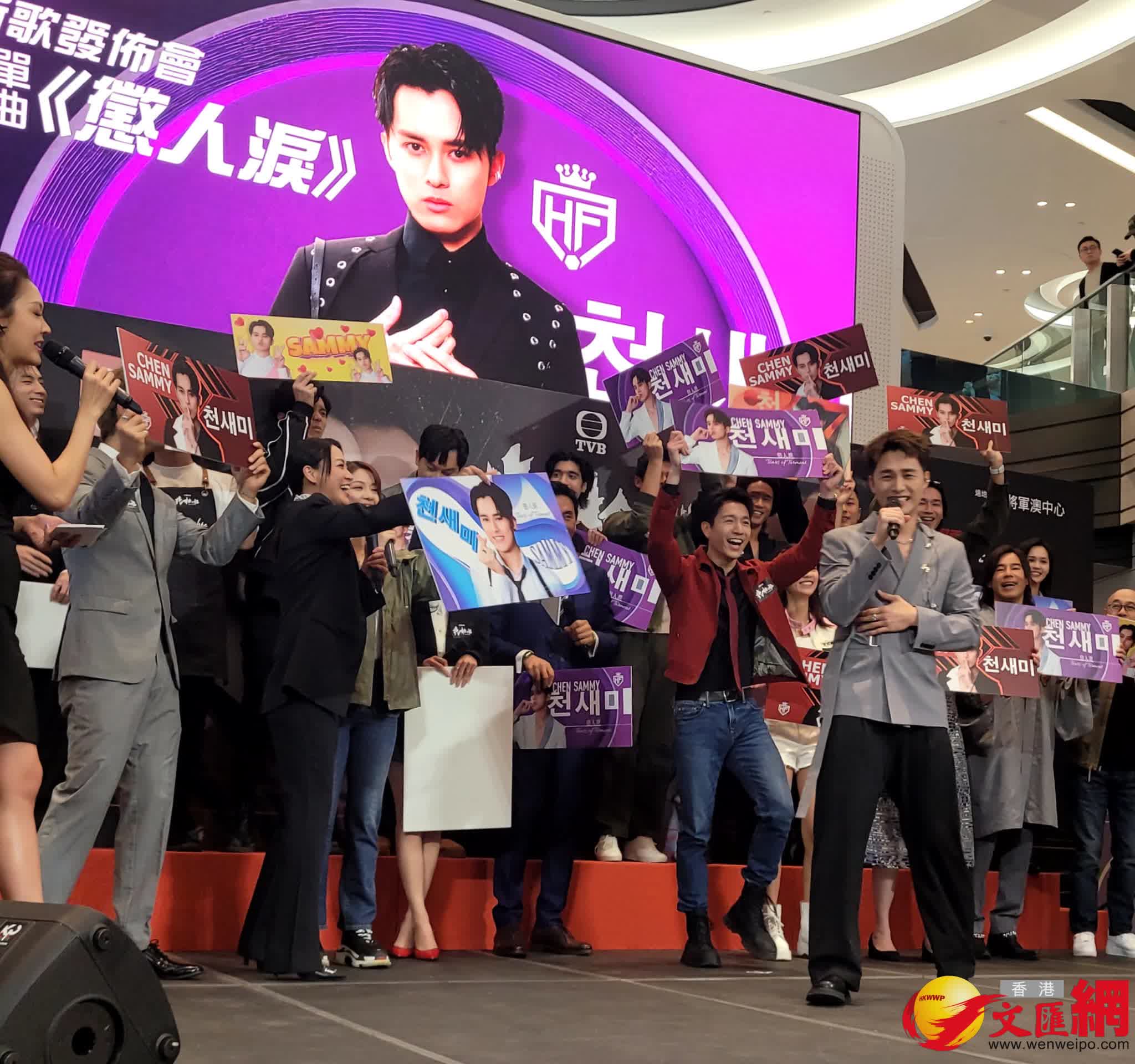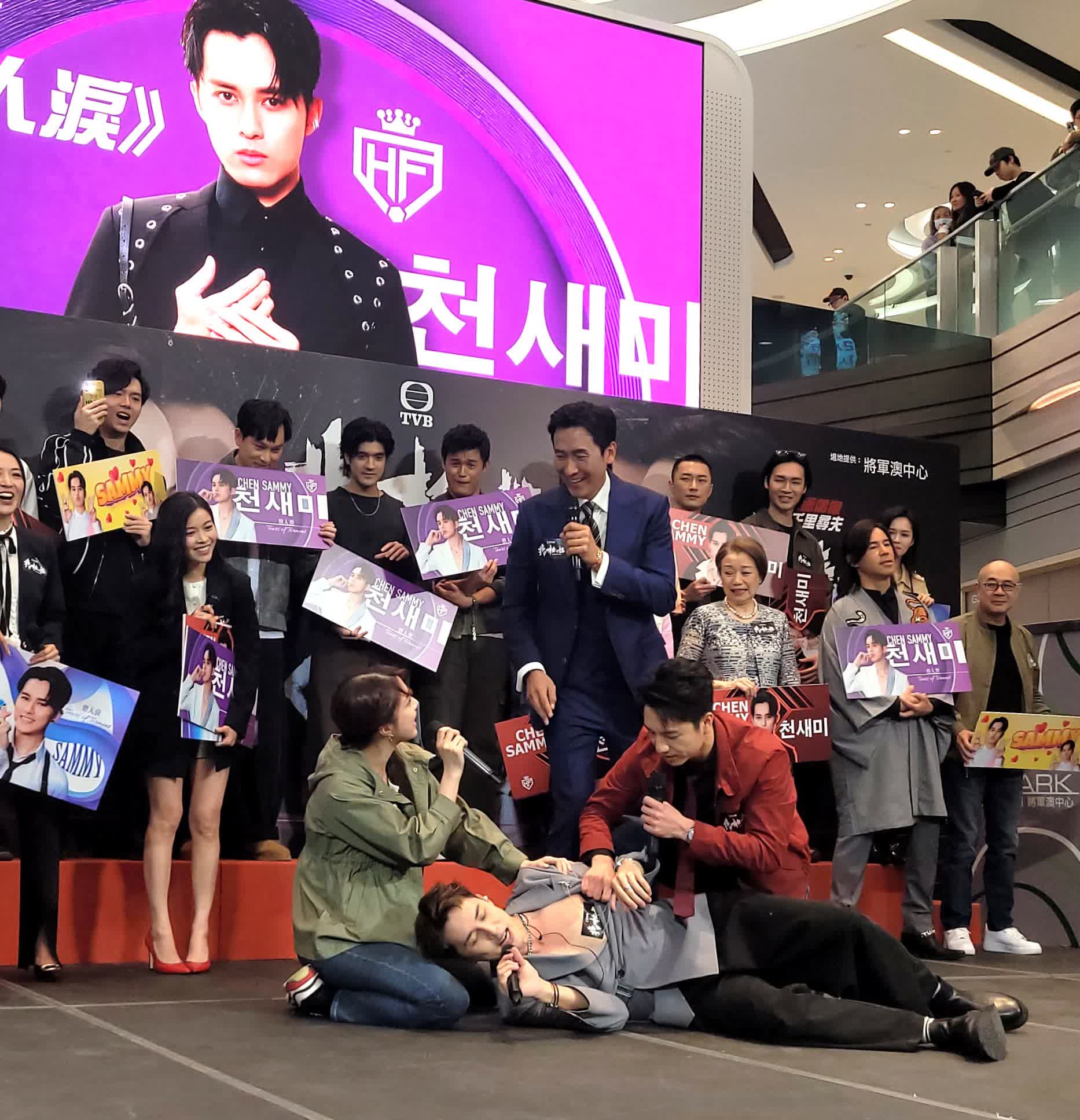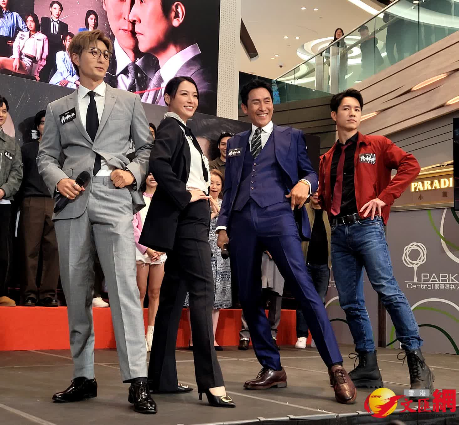 香港文匯報訊(記者 梁靜儀)馬德鐘、吳偉豪、賴慰玲、何廣沛、陳曉華、陳煒、陳庭欣及梁超怡等今日出席新劇《非常檢控觀》宣傳活動。何廣沛更化身劇中韓星「陳新彌 Sammy」即場獻唱插曲《懲人淚》,而一眾演員就化身小粉絲舉牌應援,其中吳偉豪更表現得十分投入。陳曉華與何廣沛又即場重現劇中情節,在台上突然撲向何廣沛,令對方整個跌在地上,更搞到他不慎露出「乳貼」(貼在胸前的宣傳貼紙);而賴慰玲則重演執文件騷腿一幕,之後又與其他女演員齊齊執文件,十分搞笑。