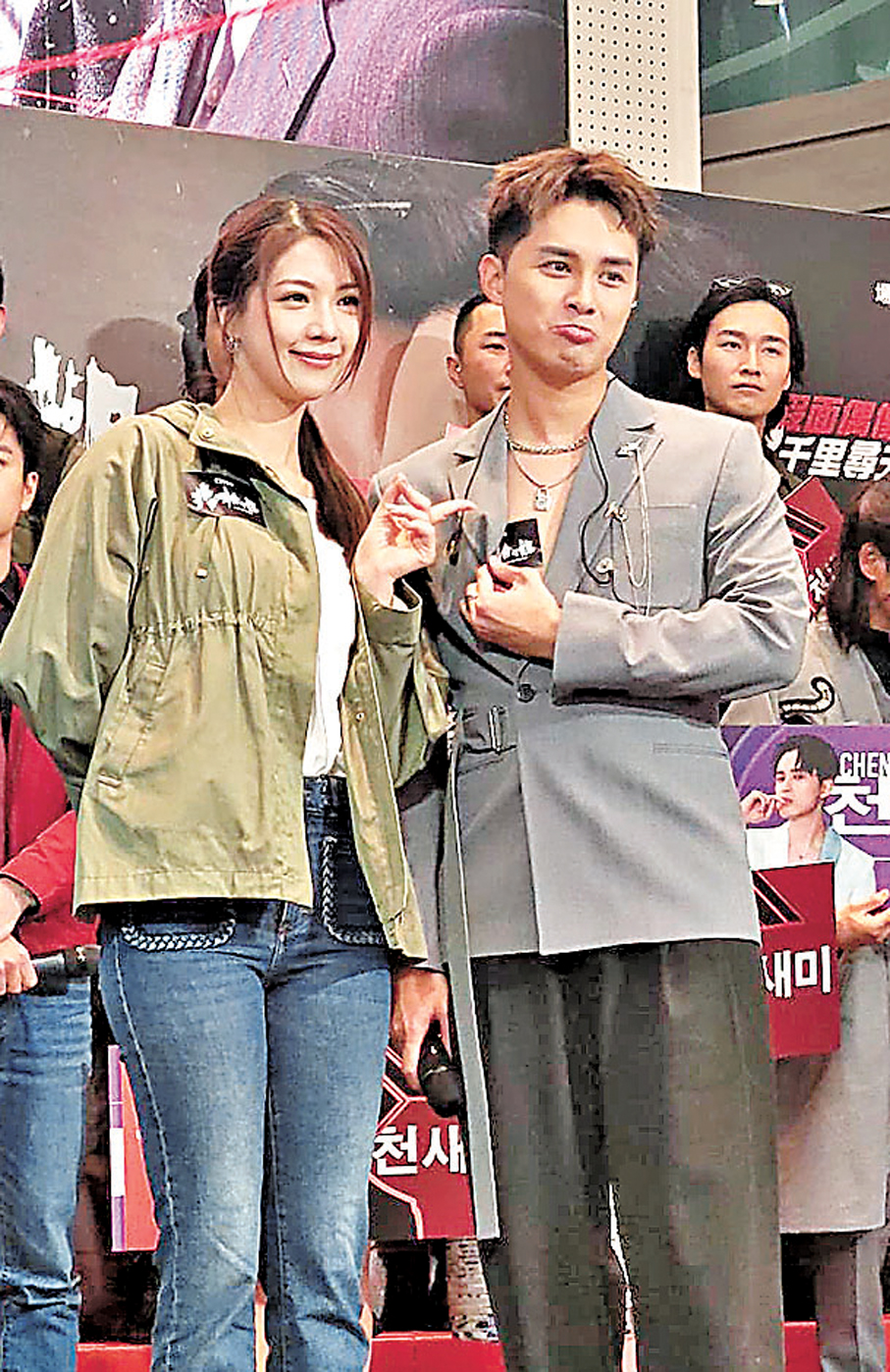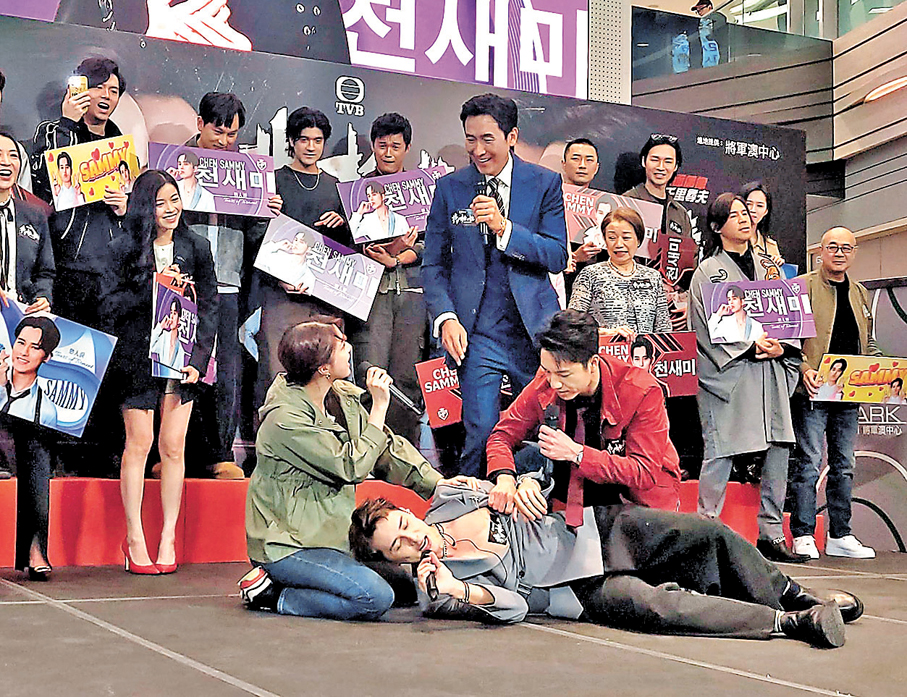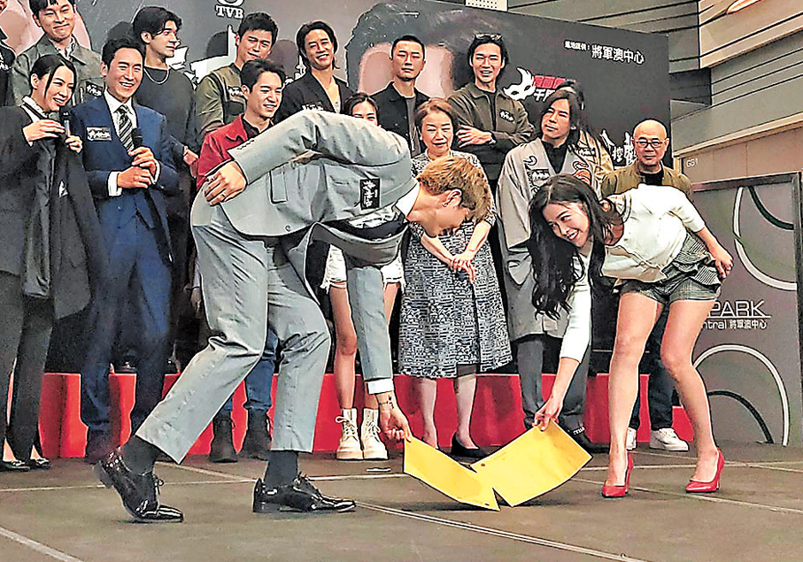 香港文匯報訊(記者 梁靜儀)馬德鐘、吳偉豪、賴慰玲、何廣沛、陳曉華、陳煒、陳庭欣及梁超怡等昨日出席新劇《非常檢控觀》宣傳活動。何廣沛更化身劇中韓星「陳新彌 Sammy」即場獻唱插曲《懲人淚》,而一眾演員就化身小粉絲舉牌應援,其中吳偉豪更表現得十分投入。陳曉華與何廣沛又即場重現劇中情節,在台上突然撲向何廣沛,令對方整個人跌在地上,更搞到他不慎露出貼在胸前的宣傳貼紙;而賴慰玲則重演執文件騷腿一幕,之後又與其他女演員齊齊執文件,十分搞笑。