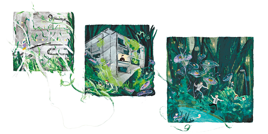 李鈺淇的《I Stole a Bag of Seeds》則更具社會隱喻色彩。她希望通過作品把一個灰色的世界帶向充滿植物和希望的童話世界,並引導觀眾思考人類與自然如何共生,構建出了一個魔幻而理想的生命圖景。作為媒體藝術家與實驗動畫導演,她亦將動畫創作中訓練出的敘事基本功應用於繪本,「繪本也需要完整的敘事,只是要提煉出最精華的定格畫面。」