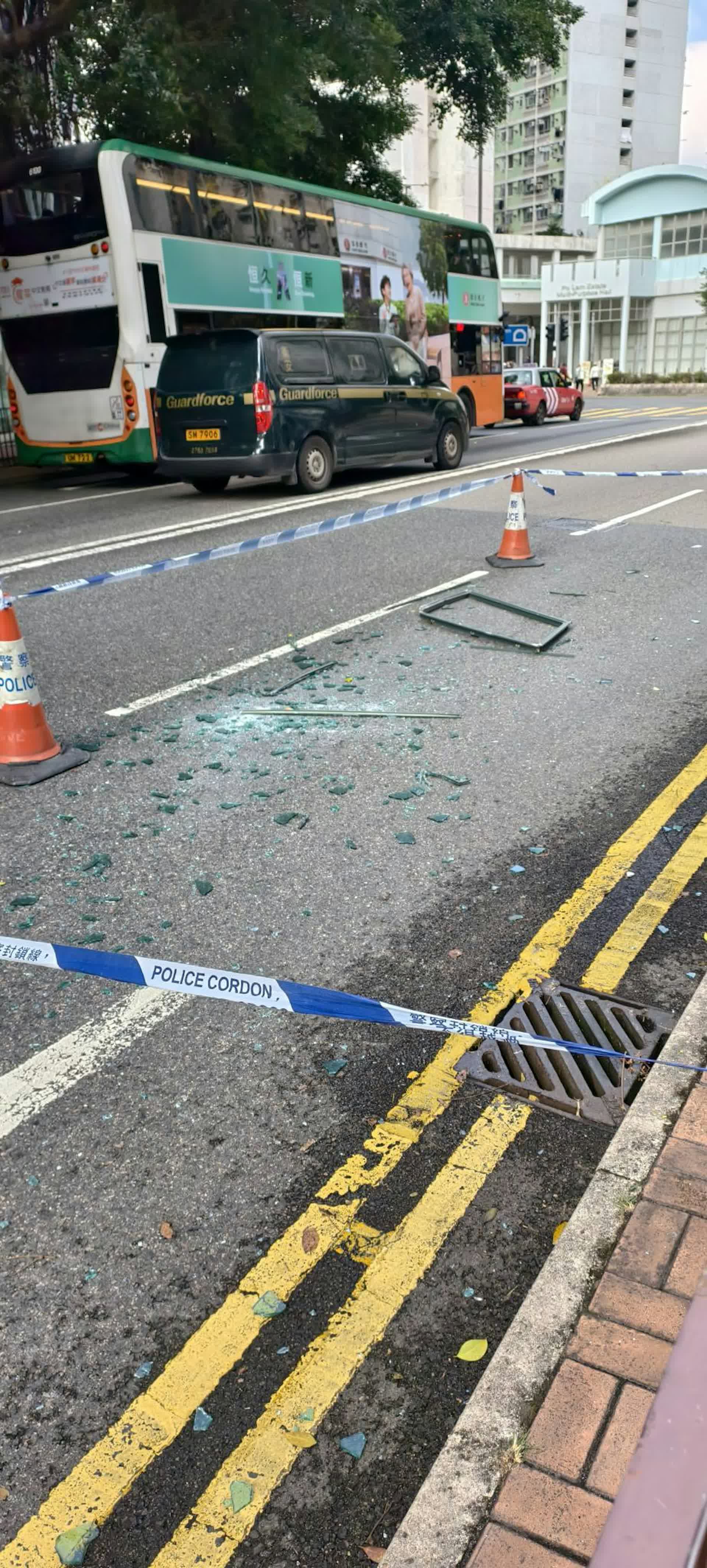 警員接報趕至,隨即圍封現場,事件中幸無人傷。警方經初步調查後,相信上址有單位正搭棚維修,其中一扇玻璃窗墮下,案中暫時無人被捕。