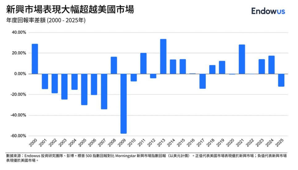 事實上,雖然美股自2009年金融海嘯以來表現優異,但其領先地位並非永恆。回顧2000年科網泡沫爆破後,新興市場就曾連續七年跑贏美股。