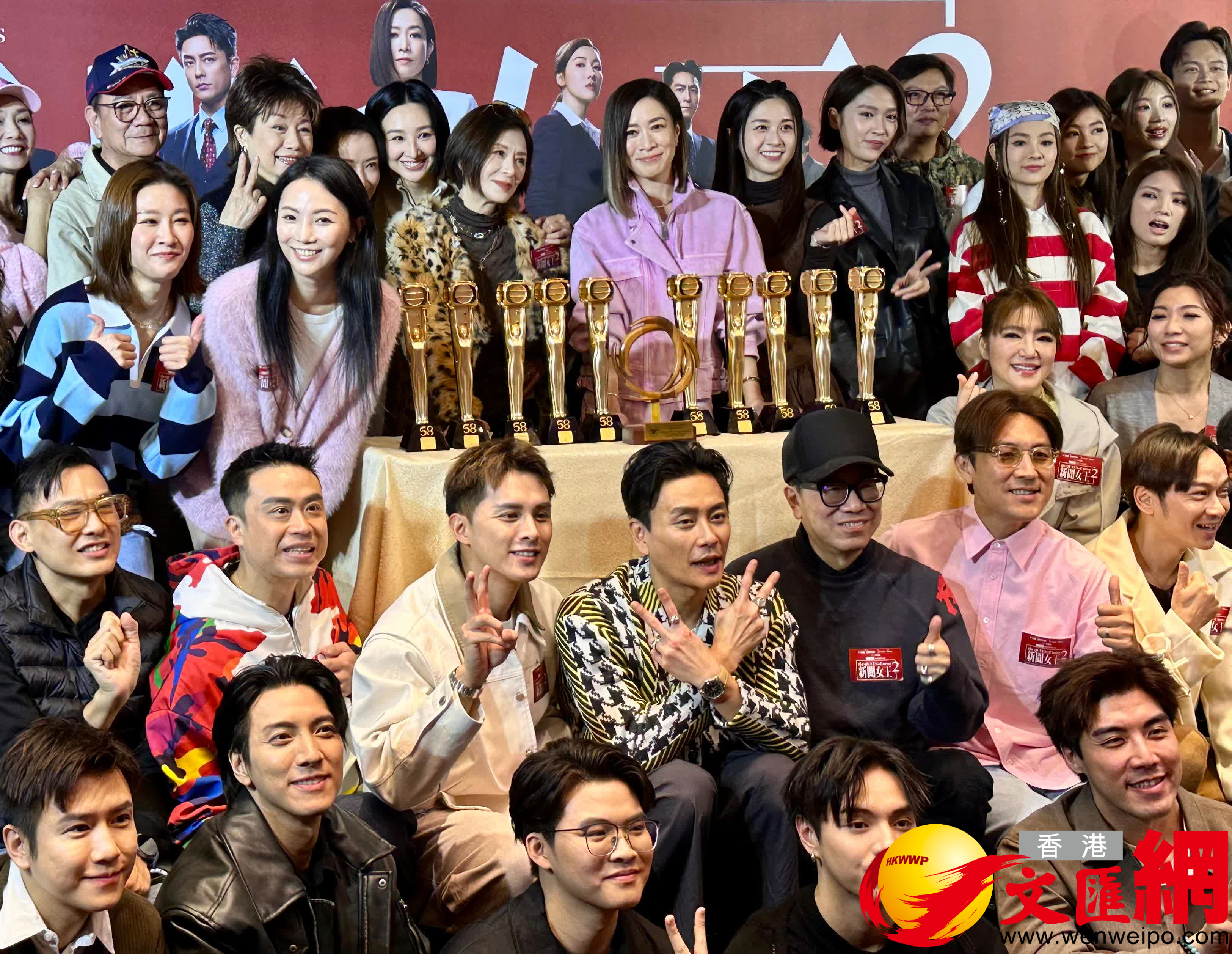 香港文匯報訊(記者 子棠)佘詩曼(阿佘)、黃宗澤(Bosco)、高海寧(高Ling)、王敏奕、吳業坤(坤哥)等劇集《新聞女王2》一眾台前幕後昨晚出席慶功宴,筵開13席,逾百人一起慶祝劇集在《萬千星輝頒獎典禮》中囊括各項大獎稱霸。今屆雙料視帝視后Bosco和阿佘在劇中鬥個你死我活,二人笑言盼再續「冤家」緣。(高Ling)、王敏奕、吳業坤(坤哥)等劇集《新聞女王2》一眾台前幕後昨晚出席慶功宴,筵開13席,逾百人一起慶祝劇集在《萬千星輝頒獎典禮》中囊括各項大獎稱霸。今屆雙料視帝視后Bosco和阿佘在劇中鬥個你死我活,二人笑言盼再續「冤家」緣。