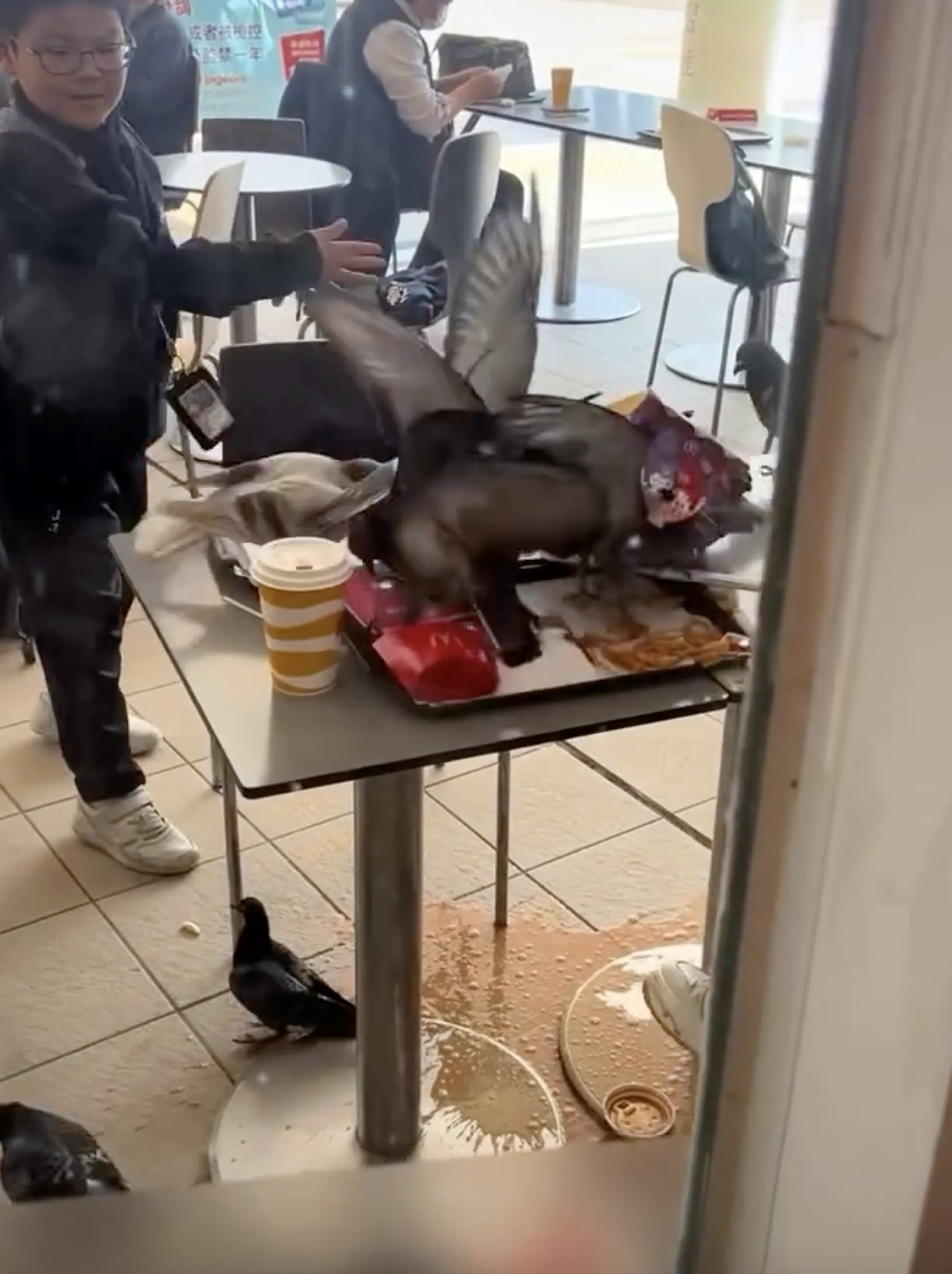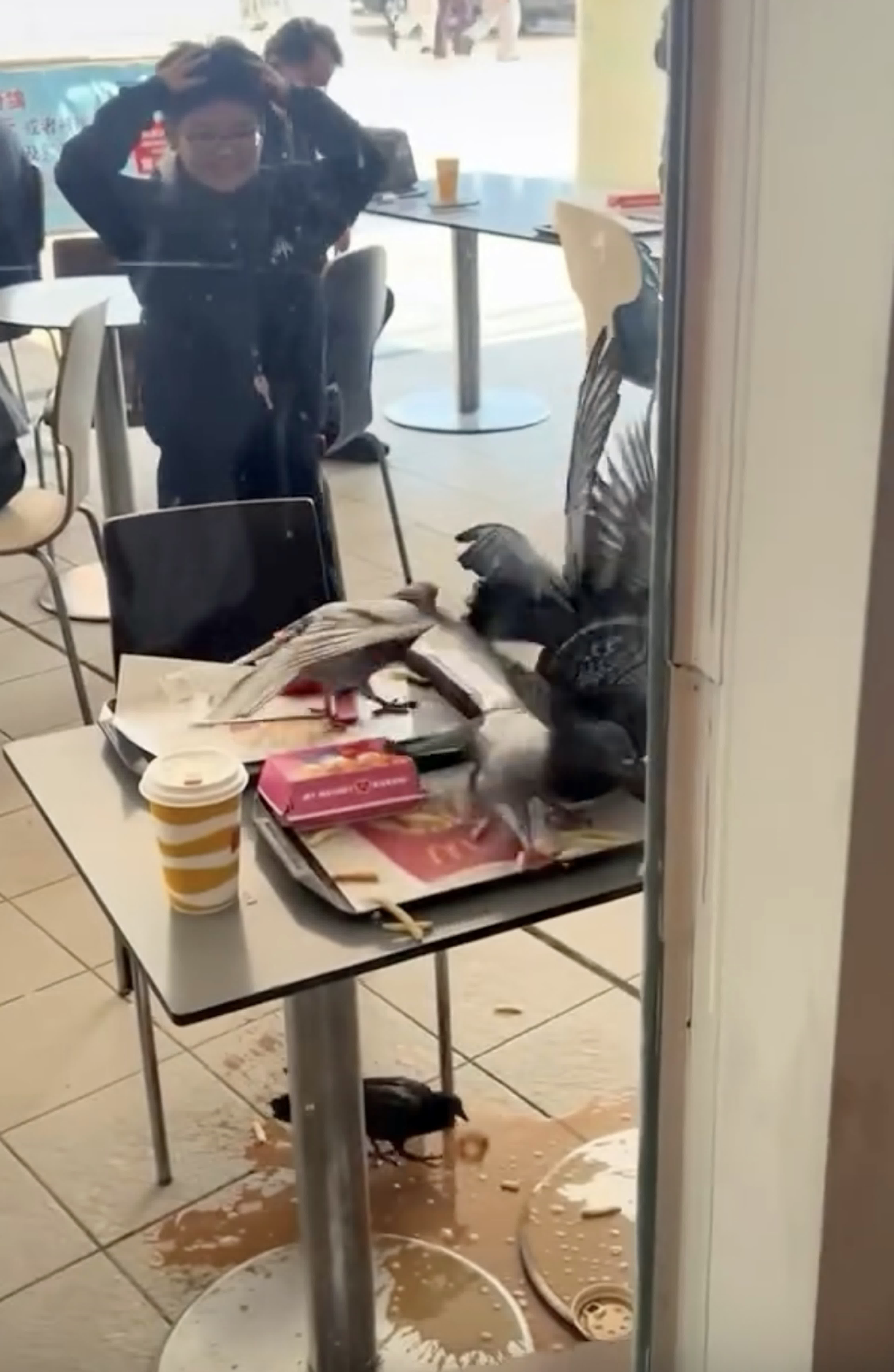 香港文匯報訊(記者 蕭景源)網上今日(19日)瘋傳一段影片可見10多隻野鴿,在九龍公園麥當勞快餐店的戶外用餐區群起瘋搶食客的食物,場面誇張,群鴿蜂擁而上,推倒飲料及食物,橫掃枱上枱下,地面倒瀉一地飲料,有男童目睹食物被掠,一度揮手驅趕,惟群鴿不為所動,欲救無從,無奈抱頭呆望。