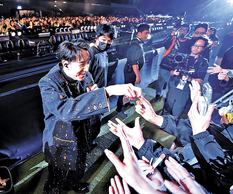 香港文匯報訊(記者 梁靜儀)馮允謙(Jay)於西九文化區舉行一連兩場的「BLUE MOON WANDERLUST 馮允謙演唱會2026」已於前晚圓滿結束。尾場騷包括寰亞老闆林建岳博士、黃淑蔓、雲浩影、炎明熹、劉沛蘅、T-Ma及林奕匡等圈中人悉數到場支持,場外更有過百粉絲「紮營」聽歌。