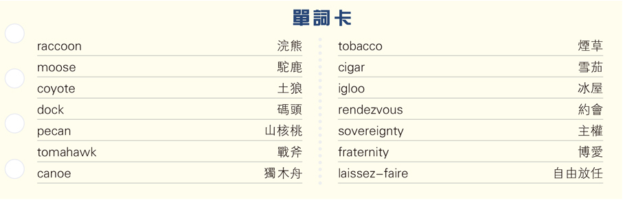 此外,許多歐洲人須向原住民請教的新事物,其名稱也直接取自原住民語言,如:raccoon(浣熊)、moose(駝鹿)、coyote(土狼)、pecan(山核桃)、tomahawk(戰斧)、canoe(獨木舟)、tobacco(煙草)、cigar(雪茄)、igloo(冰屋)、husky(哈士奇)和avocado(牛油果)。也有一些詞彙是通過其他歐洲語言轉介進入英語,例如 tomato 經由西班牙語中轉,而原住民的「莫卡辛鞋」(moccasin)則是法國人比英國人更早接觸並引入。