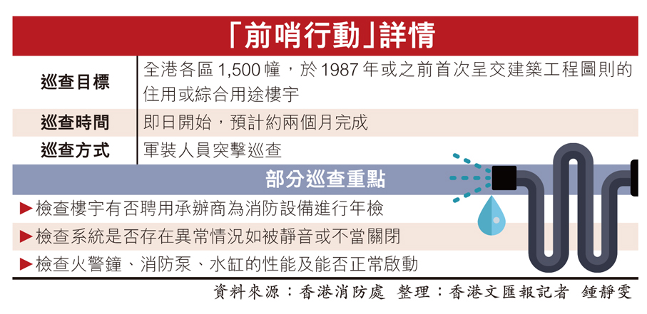 香港文匯報訊(記者 鍾靜雯)大埔宏福苑大火引發社會大眾關心樓宇消防安全。消防處繼本月初發出兩份通函,規定註冊消防裝置承辦商加強管理消防裝置後,昨日宣布即日起展開針對樓宇消防裝置及設備的「前哨行動」巡查計劃,目標在兩個月內,為1,500幢樓宇進行巡查。消防處消防區長羅建新昨日表示,該千多幢樓宇是分布全港各區、於1987年或之前首次呈交建築工程圖則的住用或綜合用途樓宇,尤其針對過去一年無進行年檢、承辦商通報有消防裝置損壞、及已通報關閉消防裝置的大廈,並強調維修消防裝置不應與樓宇大維修同時進行。若發現違規情況,會向違規者發出勸喻信、警告信,並對嚴重者提出檢控。