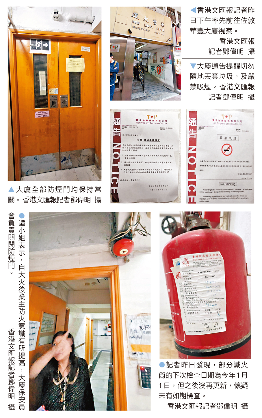 香港消防處昨日宣布展開為期兩個月的樓宇消防裝置及設備巡查行動,重點覆蓋1987年或之前興建的1,500幢住用或綜合用途建築(見另稿)。為此,香港文匯報記者昨日下午率先前往於1964年落成、2024年4月曾發生奪命火災的佐敦華豐大廈視察,發現大廈雖然全部防煙門均保持常關狀態,大部分居民亦在指定位置丟棄垃圾,遵守消防安全的基本要求,但仍存在小部分雜物堵塞後樓梯的情況,更發現部分滅火筒的下次檢查日期為今年1月1日,懷疑未有如期作更新檢查,或構成一定的安全隱患。