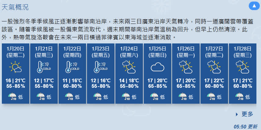天文台今日(20日)表示,一股強烈冬季季候風正逐漸影響華南沿岸,預料本港今晚轉吹北風,市區氣溫顯著下降至最低約16度,新界再低兩三度;明日至星期五大致多雲,天氣持續寒冷,市區最低氣溫在11、12度左右,新界再低兩三度,周末期間早上仍然清涼。