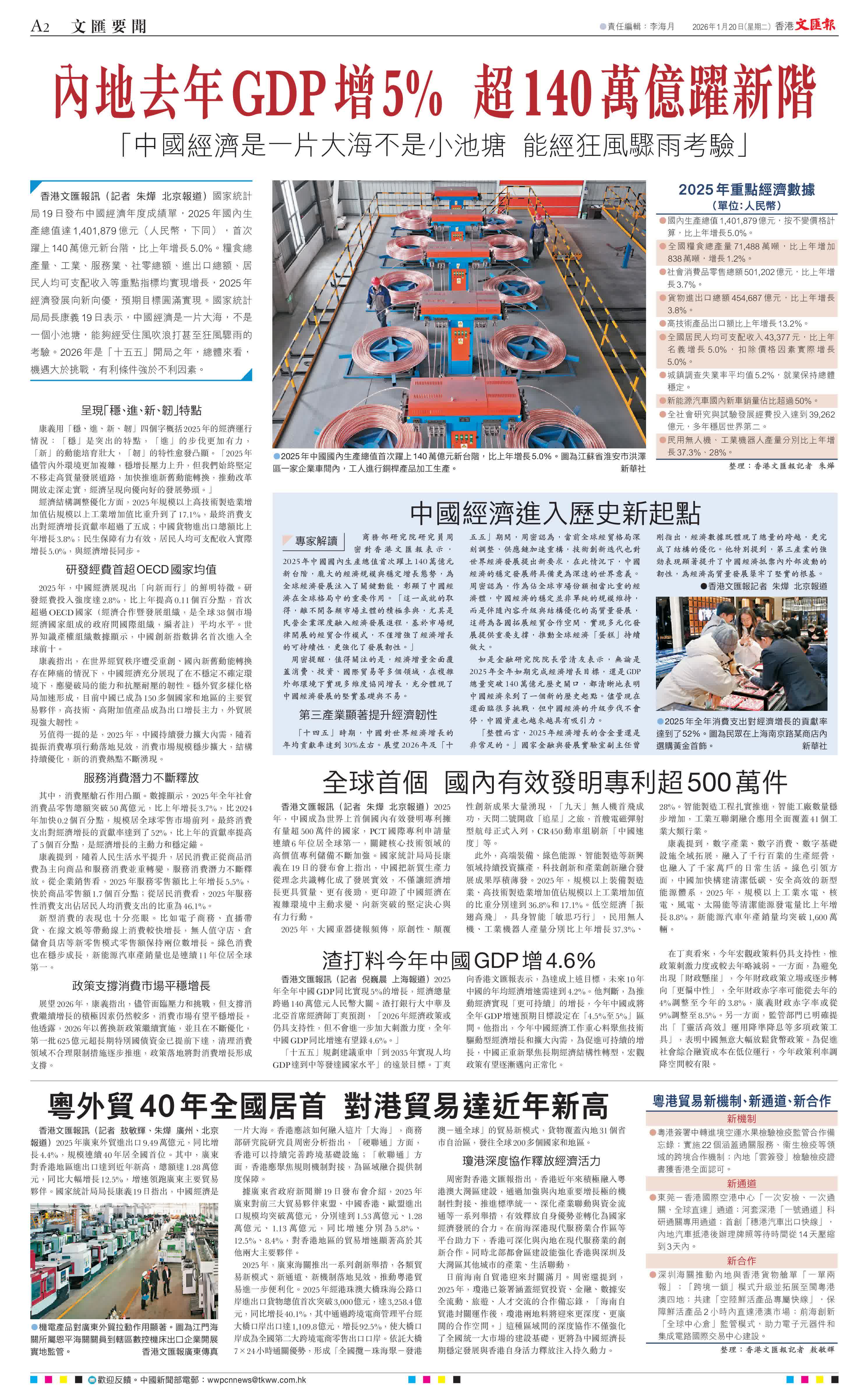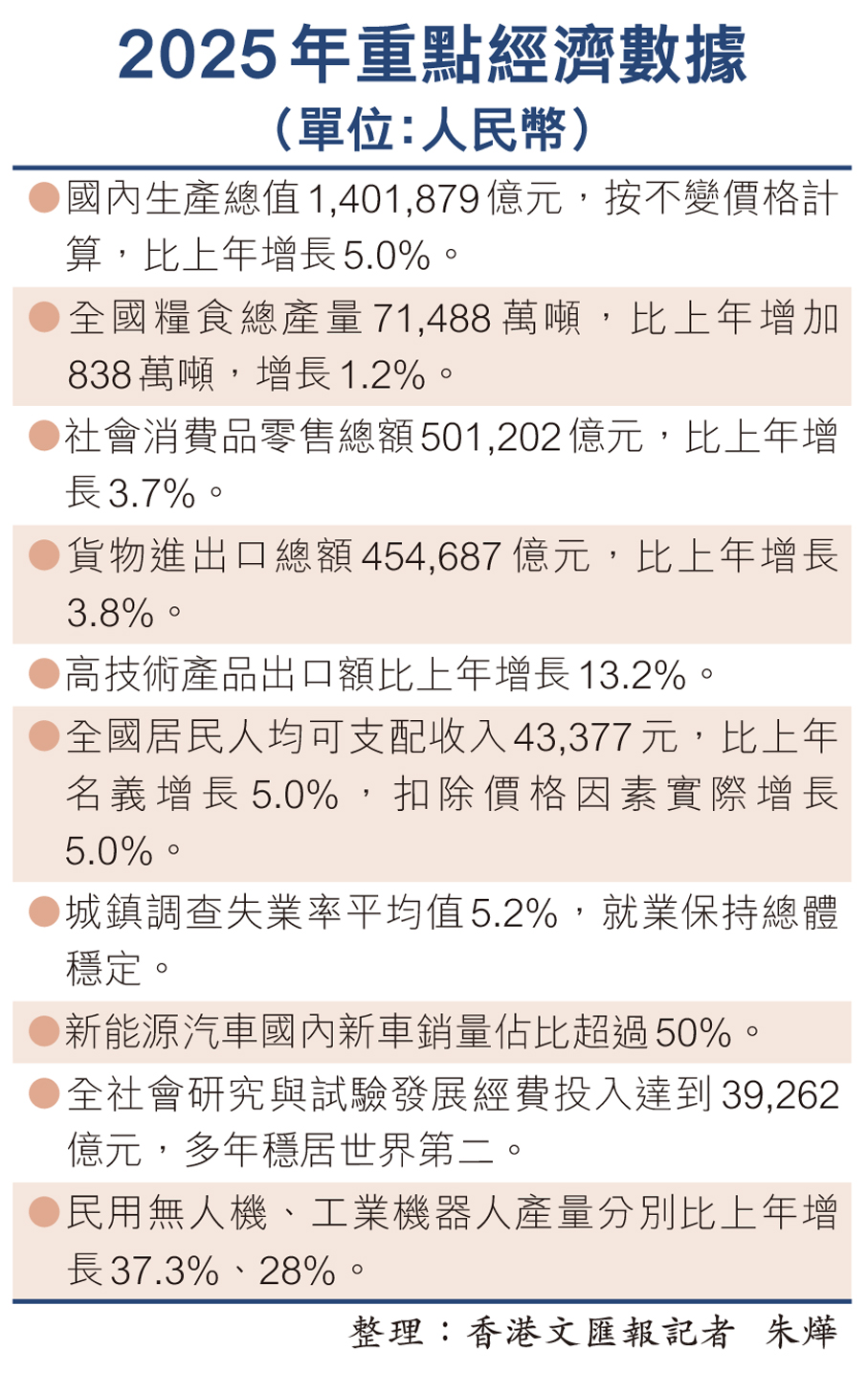 香港文匯報訊(記者 朱燁 北京報道)國家統計局19日發布中國經濟年度成績單,2025年國內生產總值達1,401,879億元(人民幣,下同),首次躍上140萬億元新台階,比上年增長5.0%。糧食總產量、工業、服務業、社零總額、進出口總額、居民人均可支配收入等重點指標均實現增長,2025年經濟發展向新向優,預期目標圓滿實現。國家統計局局長康義19日表示,中國經濟是一片大海,不是一個小池塘,能夠經受住風吹浪打甚至狂風驟雨的考驗。2026年是「十五五」開局之年,總體來看,機遇大於挑戰,有利條件強於不利因素。