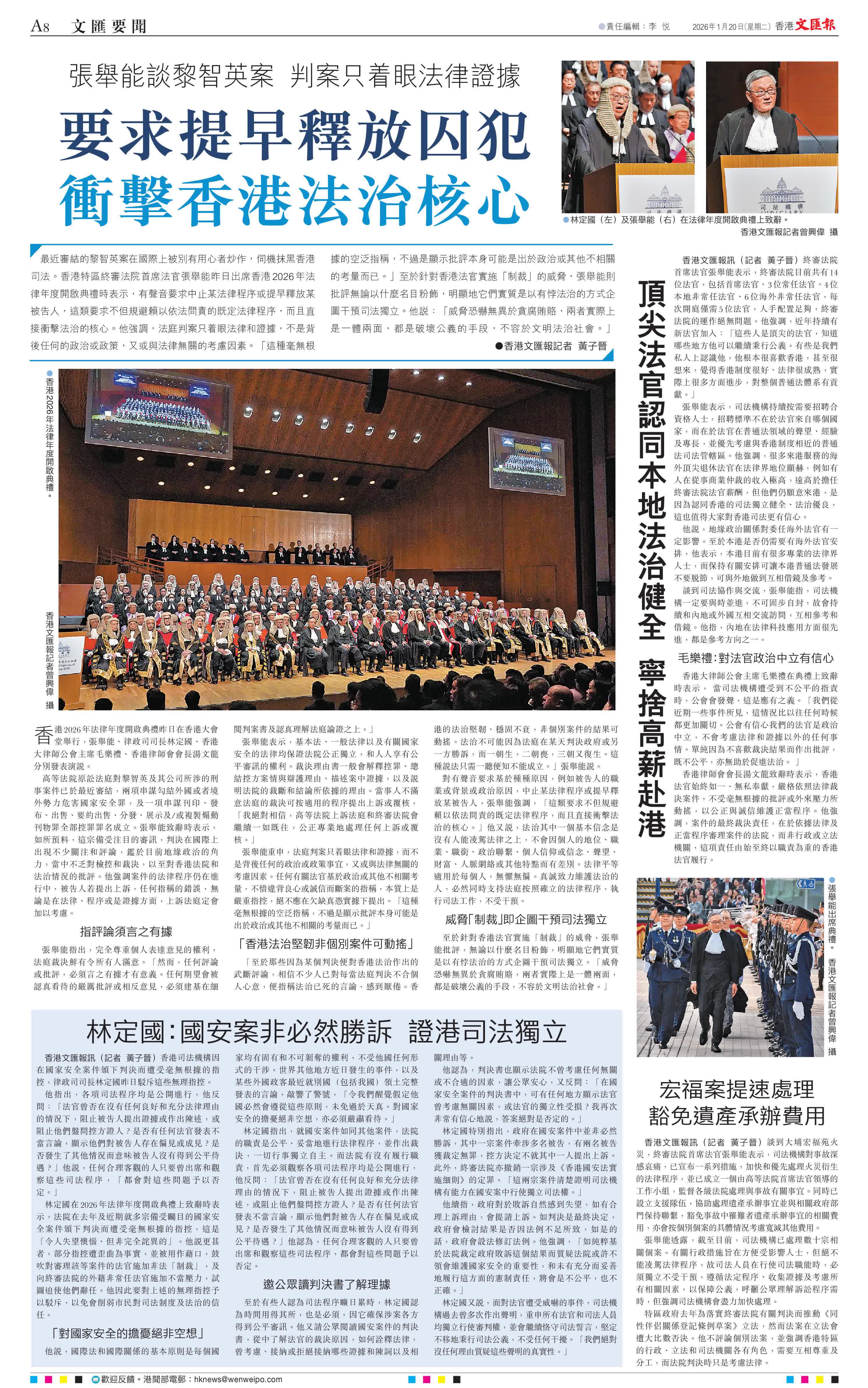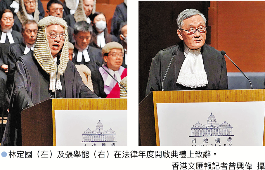 (香港文匯報記者 黃子晉)最近審結的黎智英案在國際上被別有用心者炒作,伺機抹黑香港司法。香港特區終審法院首席法官張舉能昨日出席香港2026年法律年度開啟典禮時表示,有聲音要求中止某法律程序或提早釋放某被告人,這類要求不但規避賴以依法問責的既定法律程序,而且直接衝擊法治的核心。他強調,法庭判案只着眼法律和證據,不是背後任何的政治或政策,又或與法律無關的考慮因素。「這種毫無根據的空泛指稱,不過是顯示批評本身可能是出於政治或其他不相關的考量而已。」至於針對香港法官實施「制裁」的威脅,張舉能則批評無論以什麼名目粉飾,明顯地它們實質是以有悖法治的方式企圖干預司法獨立。他說:「威脅恐嚇無異於貪腐賄賂,兩者實際上是一體兩面,都是破壞公義的手段,不容於文明法治社會。」