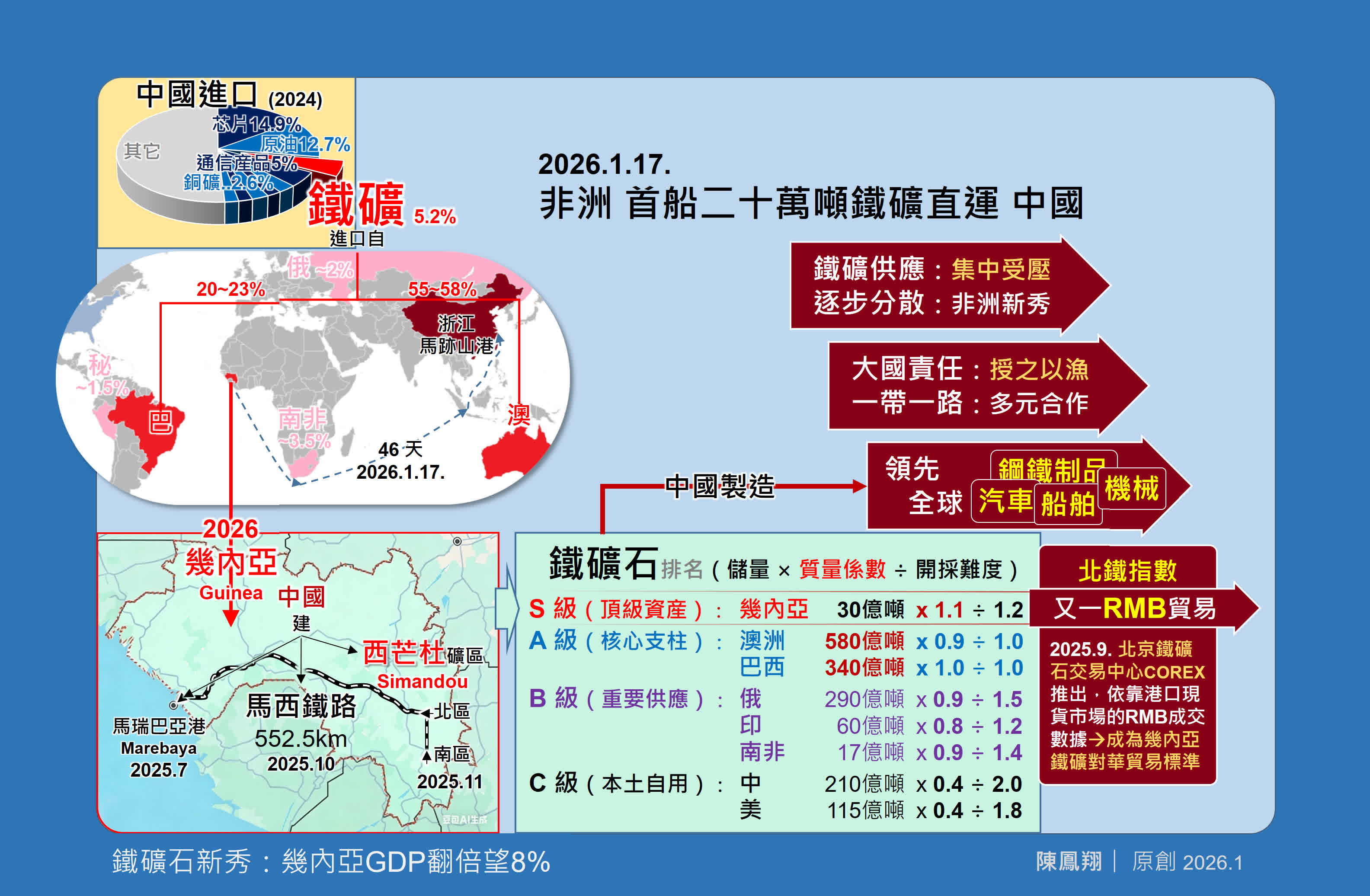 總括而言,非洲鐵礦首船抵華,既破解中國鐵礦供應依賴、鞏固工業安全,亦是「一帶一路」中非互利共贏的典範。從基建打通資源通道、人民幣定價權突破,到支撐下游製造領先,不僅激活幾內亞資源潛能,更彰顯中國在全球資源合作中的「大國擔當」,為構建多元穩定的全球供應鏈提供了中國方案。