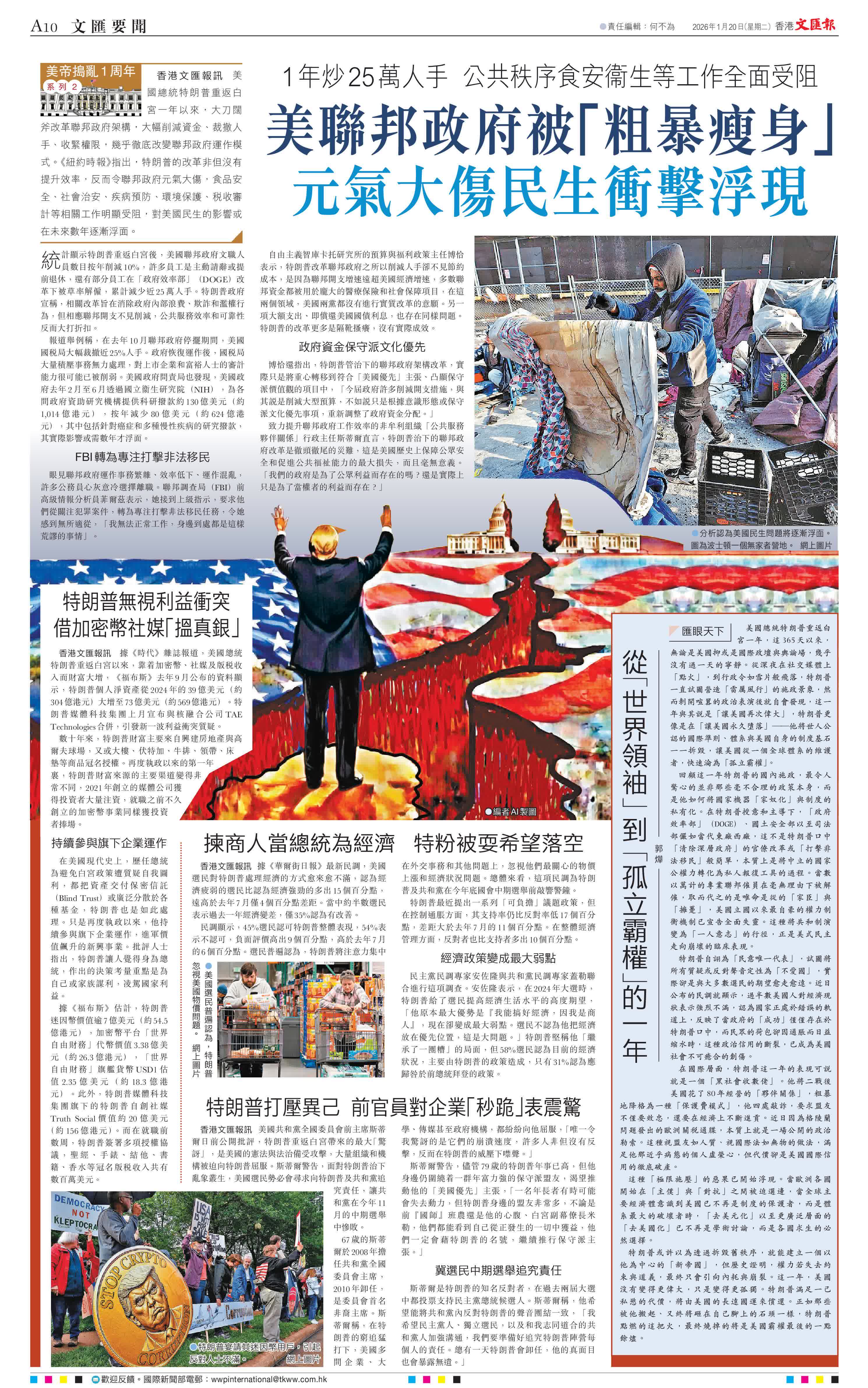 香港文匯報訊 美國總統特朗普重返白宮一年以來,大刀闊斧改革聯邦政府架構,大幅削減資金、裁撤人手、收緊權限,幾乎徹底改變聯邦政府運作模式。《紐約時報》指出,特朗普的改革非但沒有提升效率,反而令聯邦政府元氣大傷,食品安全、社會治安、疾病預防、環境保護、稅收審計等相關工作明顯受阻,對美國民生的影響或在未來數年逐漸浮面。