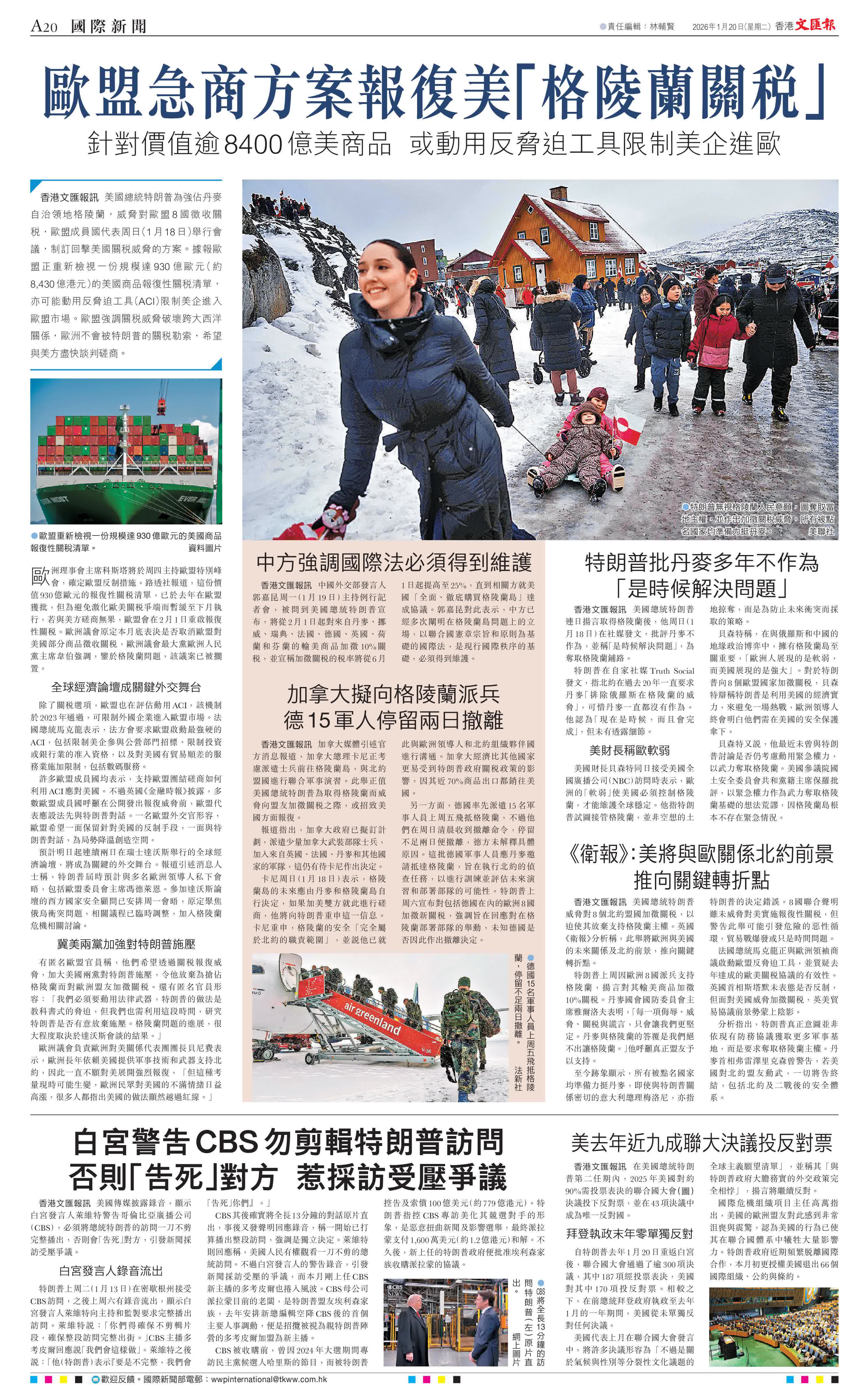 香港文匯報訊 美國總統特朗普為強佔丹麥自治領地格陵蘭,威脅對歐盟8國徵收關稅,歐盟成員國代表周日(1月18日)舉行會議,制訂回擊美國關稅威脅的方案。據報歐盟正重新檢視一份規模達930億歐元(約8,430億港元)的美國商品報復性關稅清單,亦可能動用反脅迫工具(ACI)限制美企進入歐盟市場。歐盟強調關稅威脅破壞跨大西洋關係,歐洲不會被特朗普的關稅勒索,希望與美方盡快談判磋商。