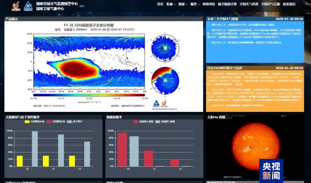 風雲三號H星也從太空拍攝到了北半球的極光圖,由此可以直觀看出哪些區域出現了極光。根據太陽活動情況,中國氣象局空間天氣監測預警中心對未來一段時間的空間天氣情況做出了判斷:預計未來三天,太陽活動水平中等,有可能爆發M級以上耀斑;受冕洞和CME共同影響,20日可能出現大地磁暴,21日可能出現小地磁暴,22日地磁活動平靜到活躍;受可能發生的地磁暴影響,電離層天氣可能出現擾動。