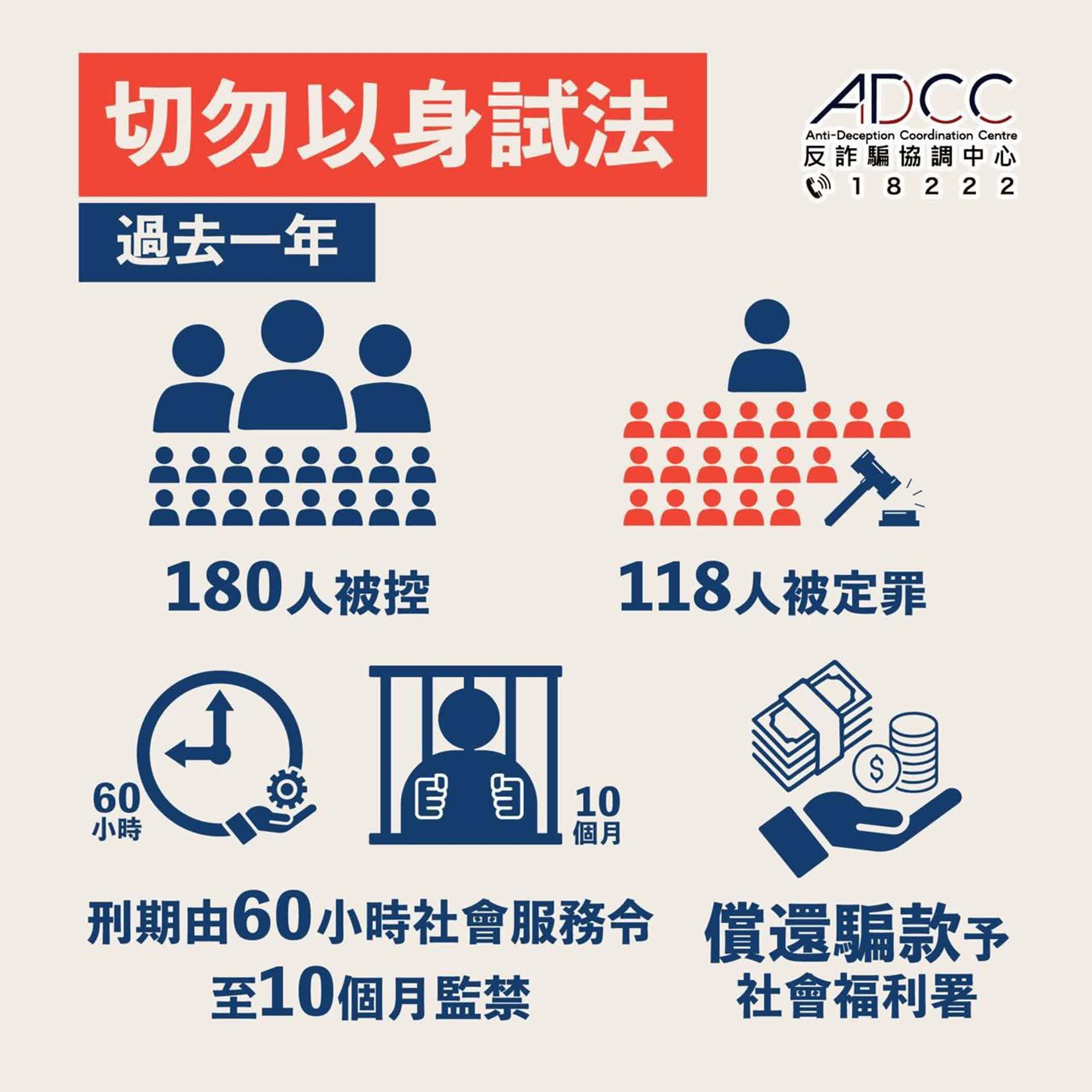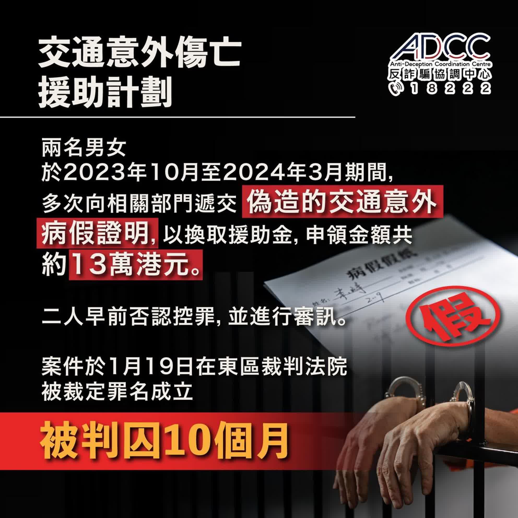 個案中,兩名男女於2023年10月至2024年3月期間,多次向社署提供偽造病假證明,騙取共約13萬元的援助金,被警方起訴後2人否認控罪,案件最終於昨日(19日)經東區裁判法院審訊後,兩名被告被裁定罪名成立,判處監禁10個月及須償還相關款項,為近期同類個案中最高刑期紀錄。