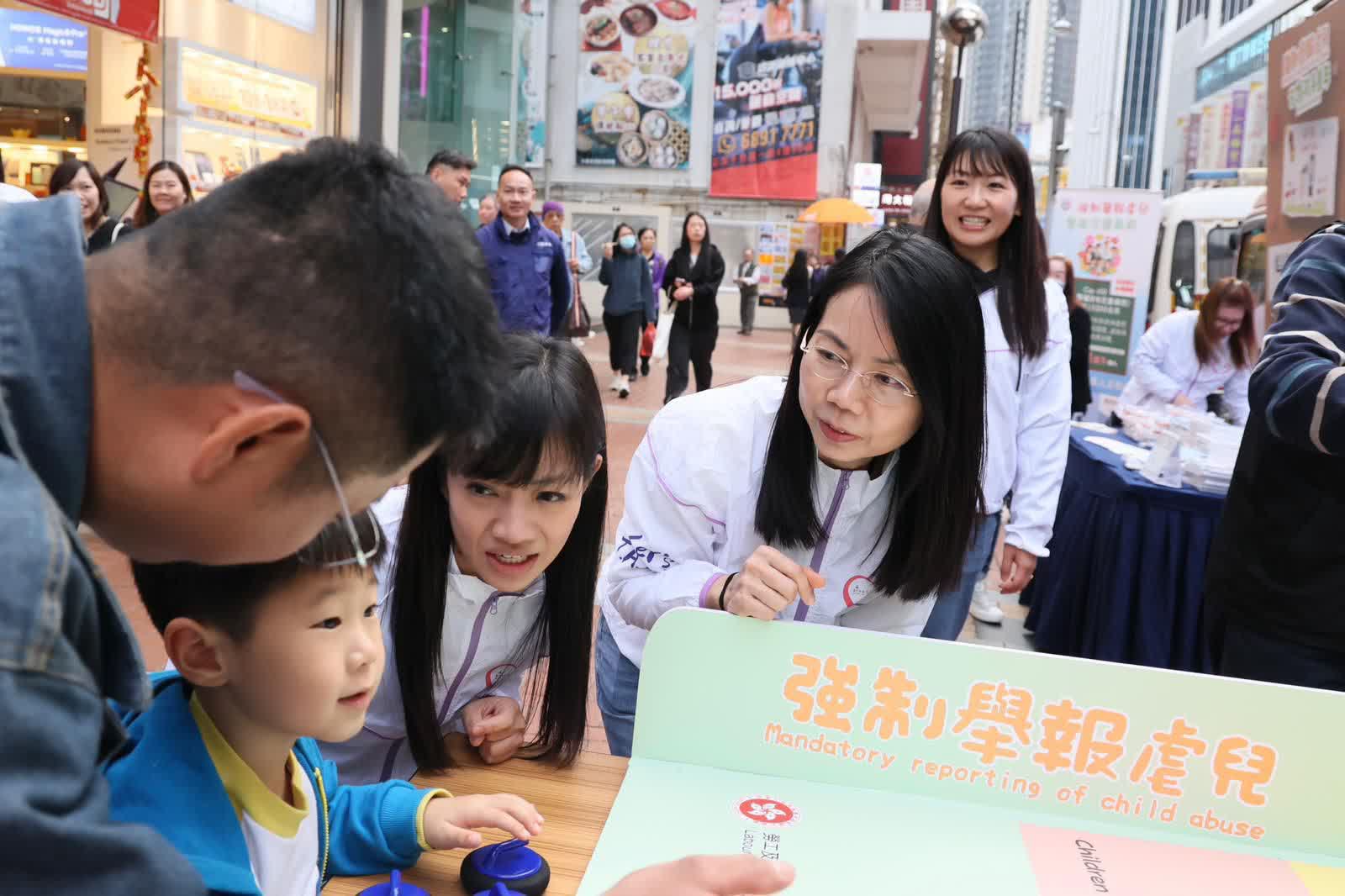 活動期間,勞工及福利局首席助理秘書長(兒童)李敬樂先生、荃灣區撲滅罪行委員會主席羅少傑先生及刑事支援科總警司余鎧均女士向市民講解法例重點,包括哪些專業人員須履行強制舉報責任、「嚴重傷害」的定義、如何識別虐待兒童情況,以及舉報機制等。人員亦透過互動遊戲,加深市民對保護兒童重要性的認識。
