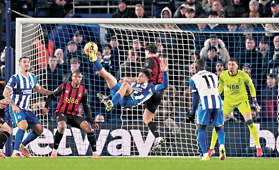 英超於香港時間周二(20日)凌晨上演獨腳戲,結果作客的般尼茅夫雖先開紀錄,但主場的白禮頓於最後階段,由18歲新星高斯杜拉斯(左三)施展「倒掛金鈎」射入世界波,助球隊扳平1:1完場。 ●美聯社