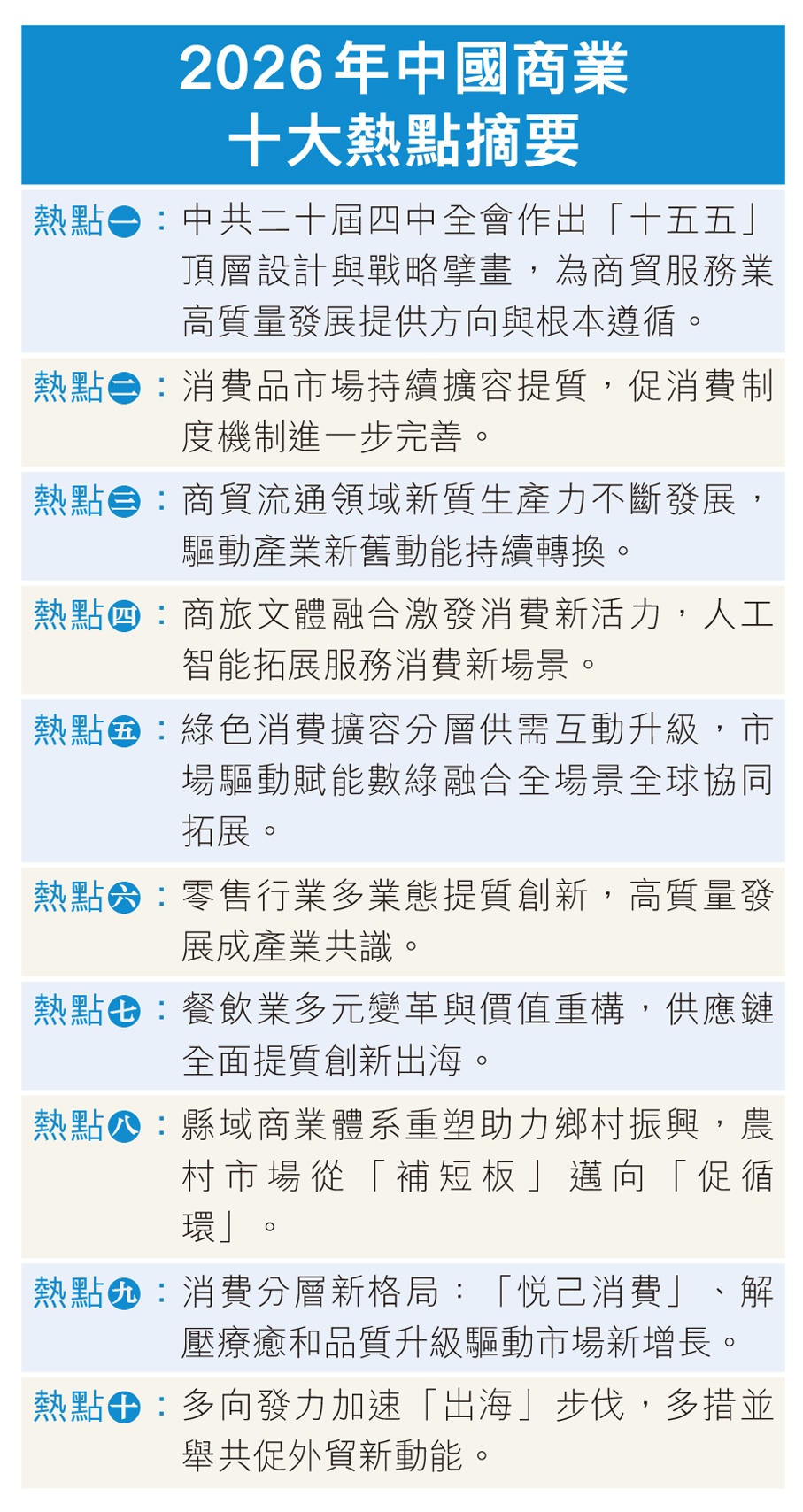 展望2026年,商業、文化、旅遊與體育的深度融合將進一步推動服務消費升級,而以數據與技術為核心的新質生產力將重塑流通體系。同時,情緒驅動與分層化消費趨勢亦將加速,反映出跨世代消費價值的深刻變化。報告同時指出,縣域商業正成為城鄉循環與鄉村振興的重要引擎;中國品牌則加快「出海」步伐,通過跨境電商、本地化策略及人工智能驅動的供應鏈解決方案,構建國際貿易新動能。