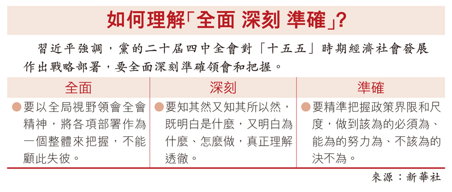 習近平強調,順利完成「十五五」時期目標任務,必須着力提高黨領導經濟社會發展能力和水平。各級幹部特別是領導幹部要進一步加強學習,鑽研黨的創新理論,提高專業素養,增強實幹本領。要樹立和踐行正確政績觀,堅持從實際出發、按規律辦事,自覺為人民出政績、以實幹出政績。要大力弘揚鬥爭精神,勇於挺身而出、迎難而上,善於戰風險、迎挑戰、克難關。要保持反腐敗高壓態勢,一步不停歇、半步不退讓,一體推進不敢腐、不能腐、不想腐。