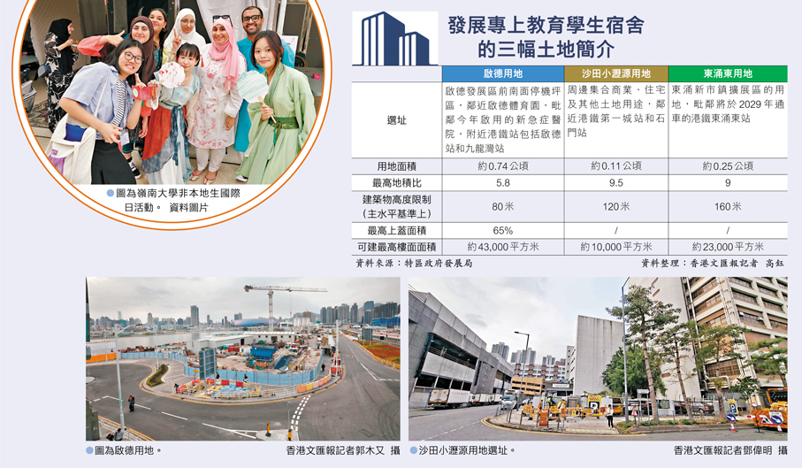 特區政府正全力推動香港建設國際教育樞紐、打造「留學香港」品牌,而為持續開拓四方生源,協助各大專院校擴容提質,特區政府發展局昨日再度出招,推出三幅分別位於啟德、沙田小瀝源及東涌東的商業用地,邀請市場提交意向書以發展專上教育學生宿舍,預計可提供約4,500個宿位。這是政府首次透過公開市場賣地鼓勵宿舍發展,最早可於2026/27年度公開招標。恒生大學副校長陳天恩表示,選址合適,絕對有興趣夥拍發展商投地。此外,去年7月推出的「城中學舍計劃」至今收到24宗申請、涉及約5,000個宿位,當中22宗獲確認符合資格,其餘兩宗處理當中。若一切順利,兩項措施可望帶來約9,500個宿位,緩解宿位供應緊張的瓶頸,為教育產業配套注入新動能。●香港文匯報記者 陸雅楠