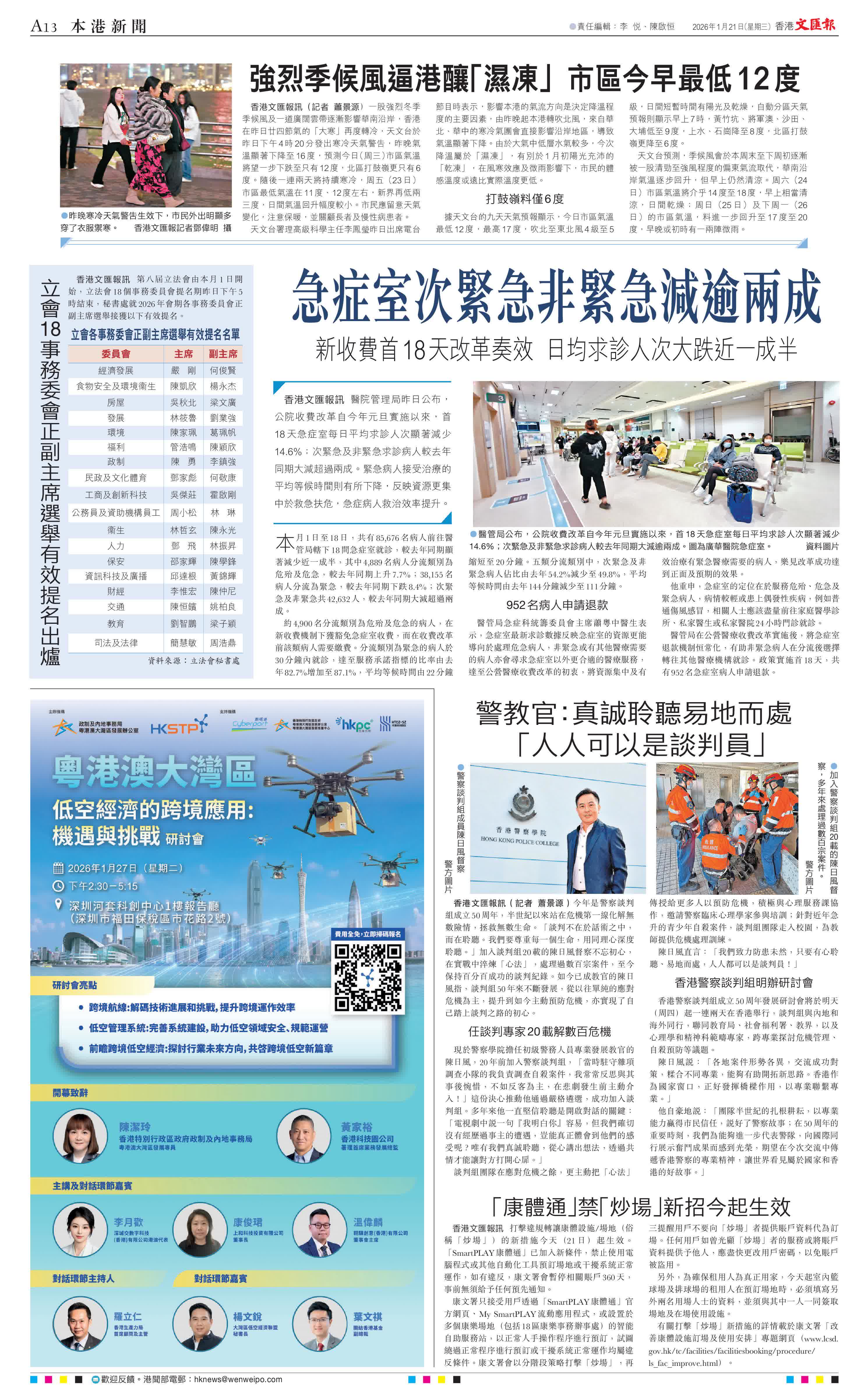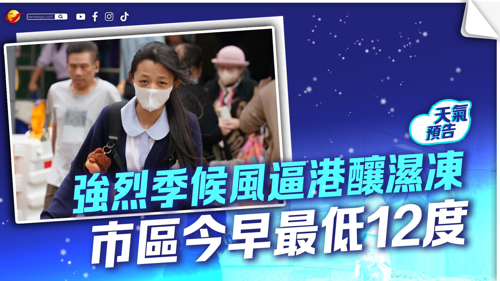 香港文匯報訊(記者 蕭景源)一股強烈冬季季候風及一道廣闊雲帶逐漸影響華南沿岸,香港在昨日廿四節氣的「大寒」再度轉冷,天文台於昨日下午4時20分發出寒冷天氣警告,昨晚氣溫顯著下降至16度,預測今日(周三)市區氣溫將望一步下跌至只有12度,北區打鼓嶺更只有6度。隨後一連兩天將持續寒冷,周五(23日)市區最低氣溫在11度、12度左右,新界再低兩三度,日間氣溫回升幅度較小。市民應留意天氣變化,注意保暖,並關顧長者及慢性病患者。