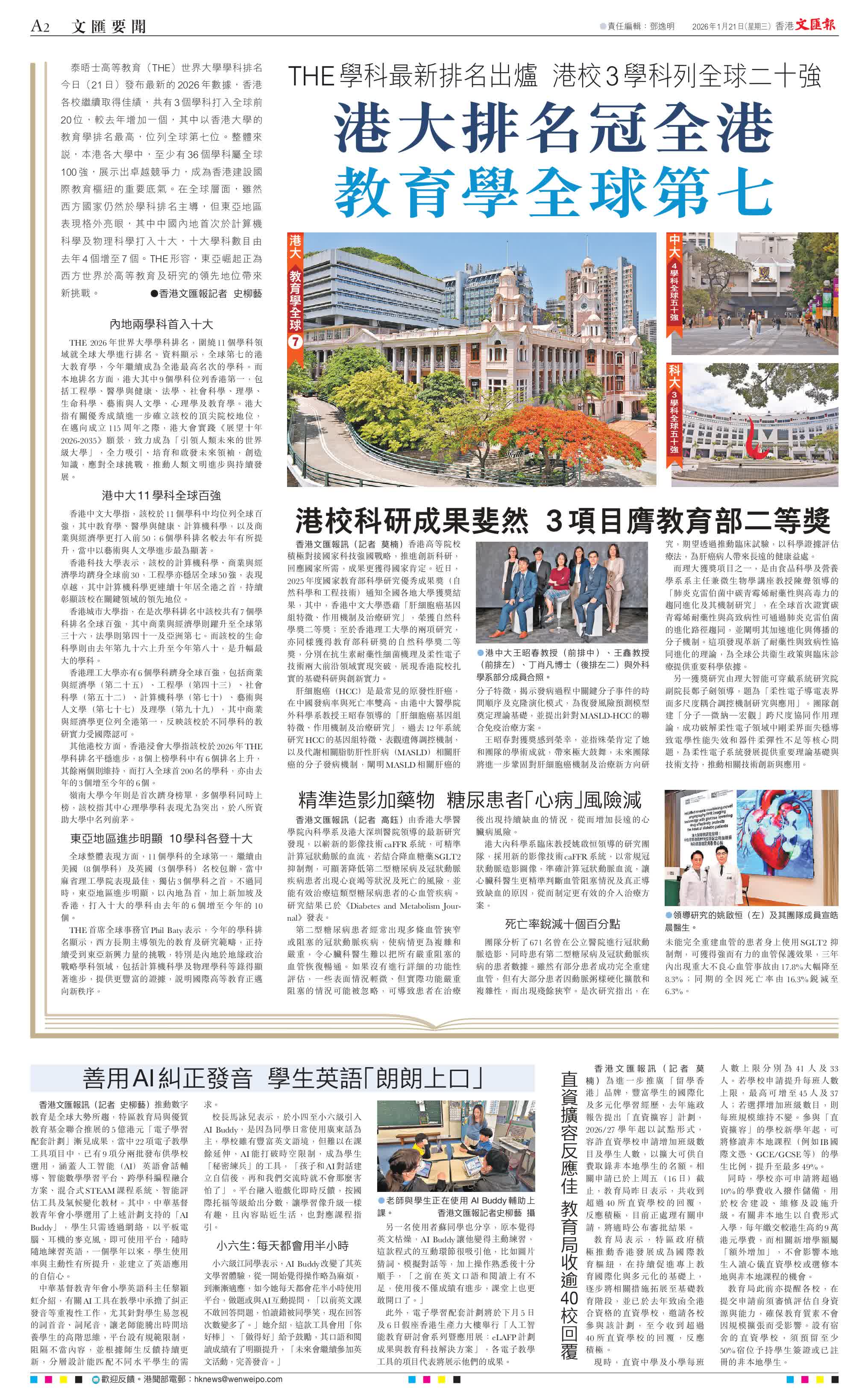 THE 2026年世界大學學科排名,圍繞11個學科領域就全球大學進行排名。資料顯示,全球第七的港大教育學,今年繼續成為全港最高名次的學科。而本地排名方面,港大其中9個學科位列香港第一,包括工程學、醫學與健康、法學、社會科學、理學、生命科學、藝術與人文學、心理學及教育學。港大指有關優秀成績進一步確立該校的頂尖院校地位,在邁向成立115周年之際,港大會實踐《展望十年2026-2035》願景,致力成為「引領人類未來的世界級大學」,全力吸引、培育和啟發未來領袖,創造知識,應對全球挑戰,推動人類文明進步與持續發展。