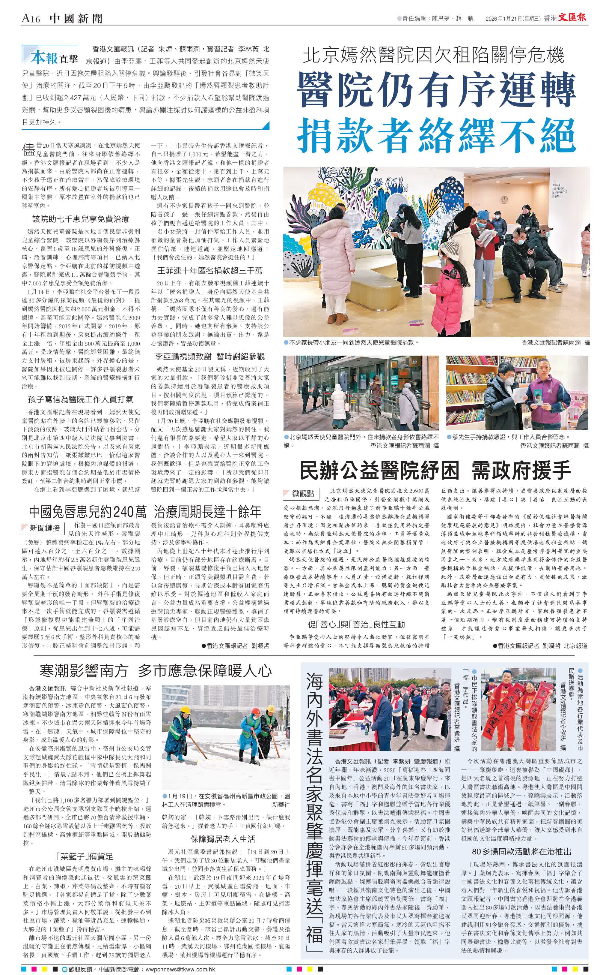 儘管20日當天寒風凜冽,在北京嫣然天使兒童醫院門前,往來身影依舊絡繹不絕。香港文匯報記者在現場看到,不少人是為捐款而來。由於醫院內部尚在正常運轉,不少孩子還正在治療當中,為保障診療環境的安靜有序,所有愛心捐贈者均被引導至一層集中等候,原本放置在室外的捐款箱也已移至室內。