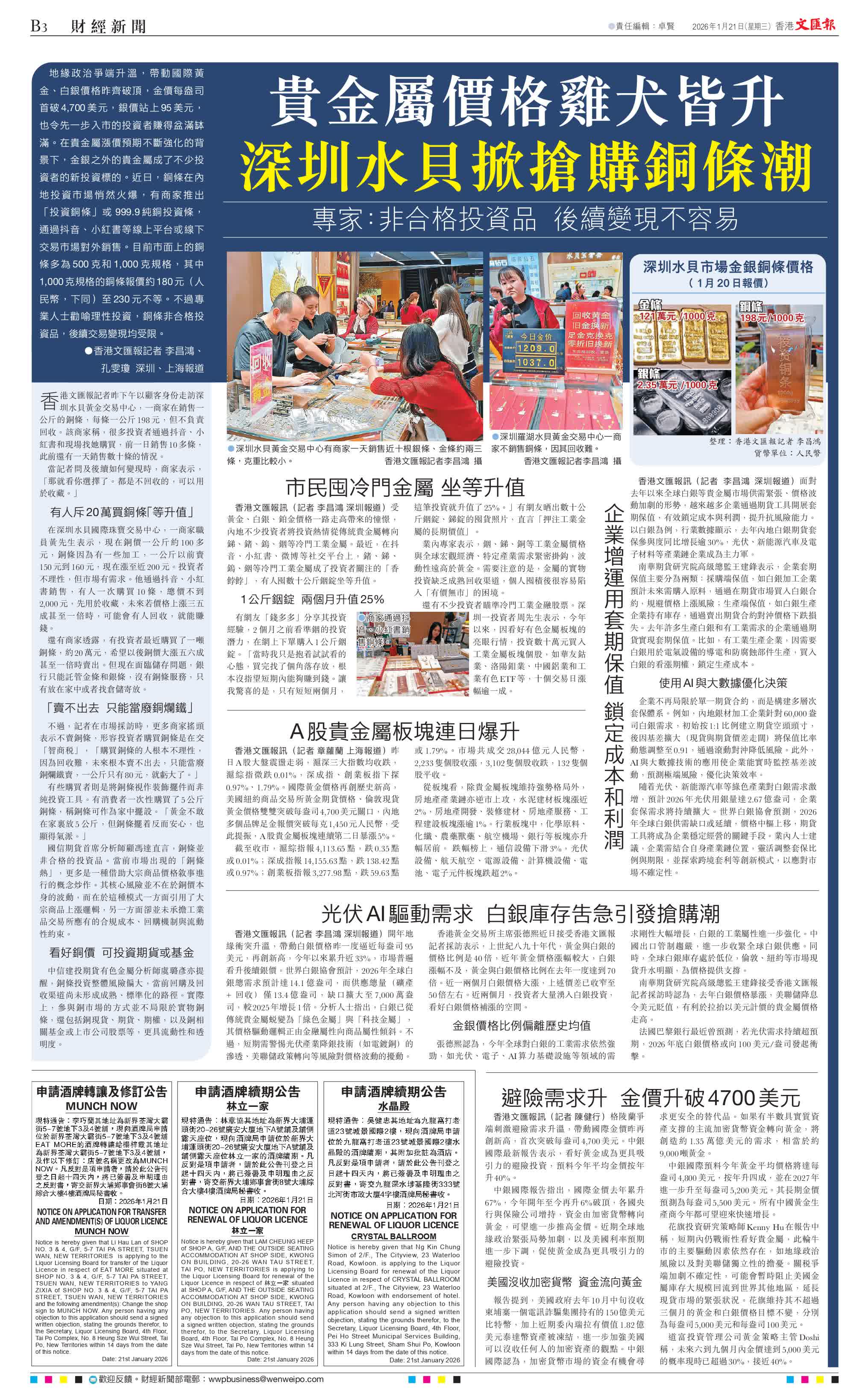 香港文匯報訊(記者 李昌鴻、孔雯瓊 深圳、上海報道)地緣政治爭端升溫,帶動國際黃金、白銀價格昨齊破頂,金價每盎司首破4,700美元,銀價站上95美元,也令先一步入市的投資者賺得盆滿缽滿。在貴金屬漲價預期不斷強化的背景下,金銀之外的貴金屬成了不少投資者的新投資標的。近日,銅條在內地投資市場悄然火爆,有商家推出「投資銅條」或 999.9純銅投資條,通過抖音、小紅書等線上平台或線下交易市場對外銷售。目前市面上的銅條多為500克和1,000克規格,其中1,000克規格的銅條報價約180元(人民幣,下同)至230元不等。不過專業人士勸喻理性投資,銅條非合格投資品,後續交易變現均受限。