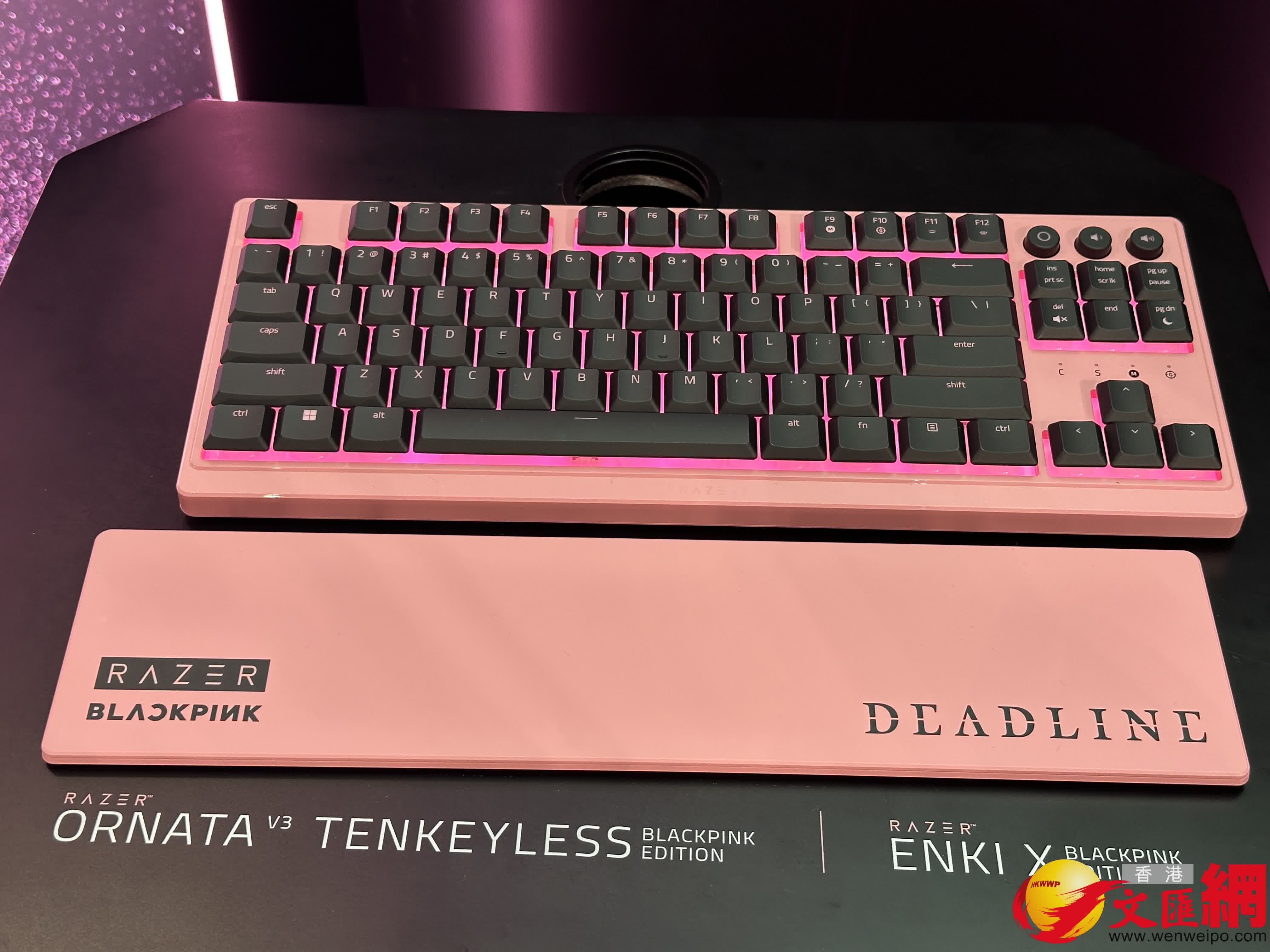 店內特別推出 BLACKPINK 與 Razer 的聯名系列,該系列結合 BLACKPINK 的標誌性配色與 Razer 的電競性能,以粉黑為主調,印有雙方品牌及「DEADLINE」字樣。系列產品包括採用機械薄膜式鍵帽與 RGB 燈效的 Razer Ornata V3 鍵盤、具備人體工學設計與 6400 DPI 靈敏度的 Razer DeathAdder Essential 光學滑鼠、配套的 Razer Gigantus V2 滑鼠墊,以及以粉黑配色設計、強調長時間使用舒適性的 Razer Enki X 電競椅。現場可親身體驗全系列商品,該聯名系列預計於 2026 年第二季度在全球正式發售。