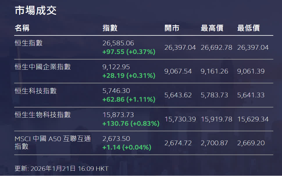香港文匯報訊 港股中止4連跌,三大指數齊齊今日反彈。恒生指數(恒指)收報26,585點,全日升97點或0.37%。國企指數升0.31%。恒生科技指數升1.11%。大市成交額增至2,504.5億元水平。