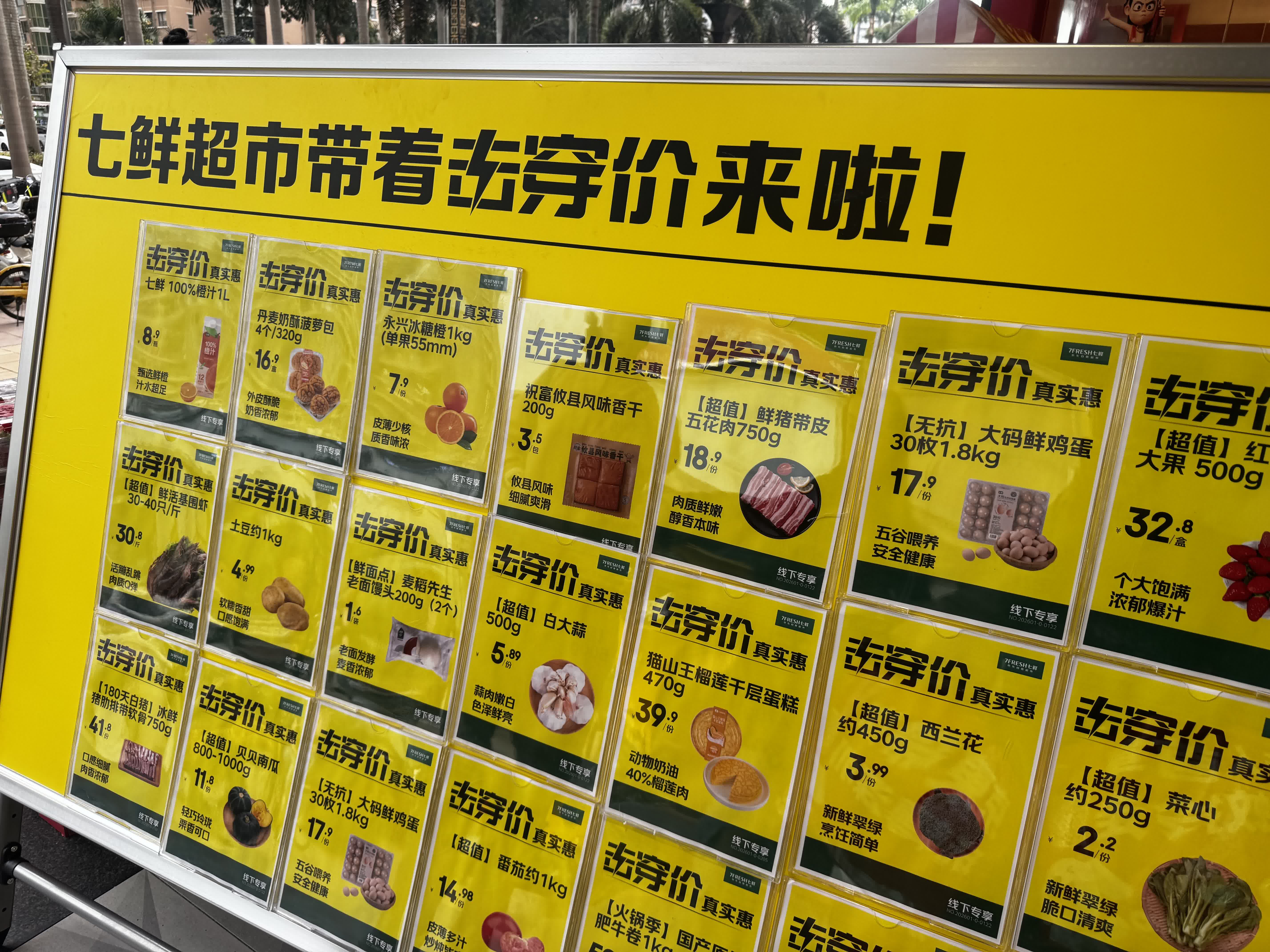 於2023年在福田口岸開業的七鮮超市,除了「活色生香」的水產海鮮、各式烘焙製品,以及保證7天內上新的雞蛋等商品外,「擊穿價」標牌亦格外引人注目。所謂「擊穿價」,是指經市場比價後訂出的最低價格。超市亦提供海鮮即場加工、焯水、去冰等服務,方便港人顧客帶食物回港。副店長黃陽表示,港人最喜愛的食材除海鮮和燒臘外,還有低溫牛奶。客人普遍反饋商品新鮮、性價比高,「蔬菜從農場到店舖只需24小時,牛奶若超過保質期一半即不再售賣」。