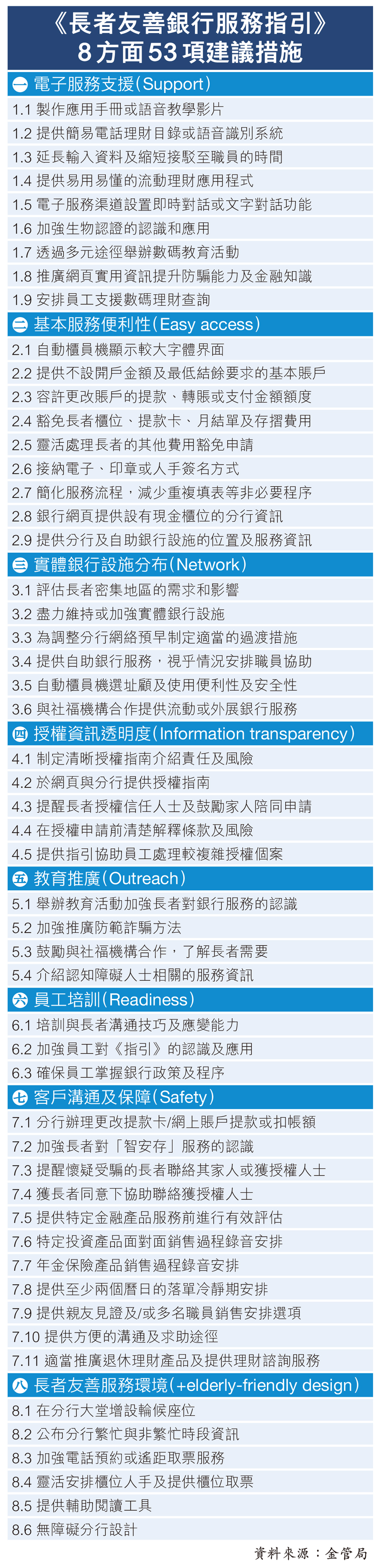 據金管局介紹,《長者友善銀行服務指引》旨在建立務實的長者友善標準,支持政府促進銀髮經濟,當中列載銀行應採納的8項主要原則、53項具體建議措施,並透過加強金融教育,協助長者掌握金融資訊及數碼技能。另外,《無障礙銀行服務實務指引(第二版)》則進一步加強無障礙銀行服務措施,以確保不同需求的客戶,包括肢體傷殘、視障、聽障客戶及長者,均獲得適切銀行服務。金管局已發出通告,要求銀行18個月內全面落實指引內措施。