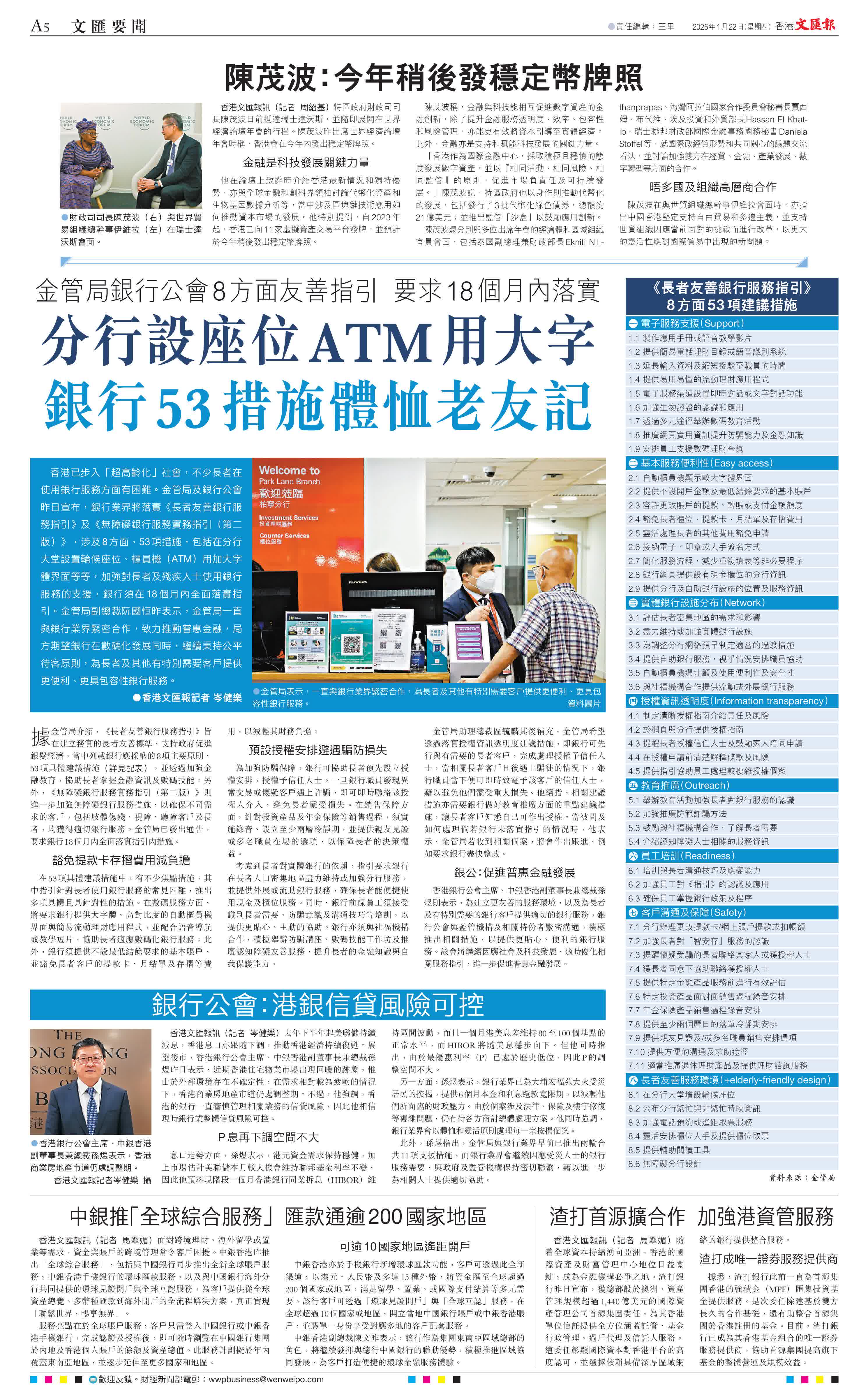 在53項具體建議措施中,有不少焦點措施,其中指引針對長者使用銀行服務的常見困難,推出多項具體且具針對性的措施。在數碼服務方面,將要求銀行提供大字體、高對比度的自動櫃員機界面與簡易流動理財應用程式,並配合語音導航或教學短片,協助長者適應數碼化銀行服務。此外,銀行須提供不設最低結餘要求的基本賬戶,並豁免長者客戶的提款卡、月結單及存摺等費用,以減輕其財務負擔。