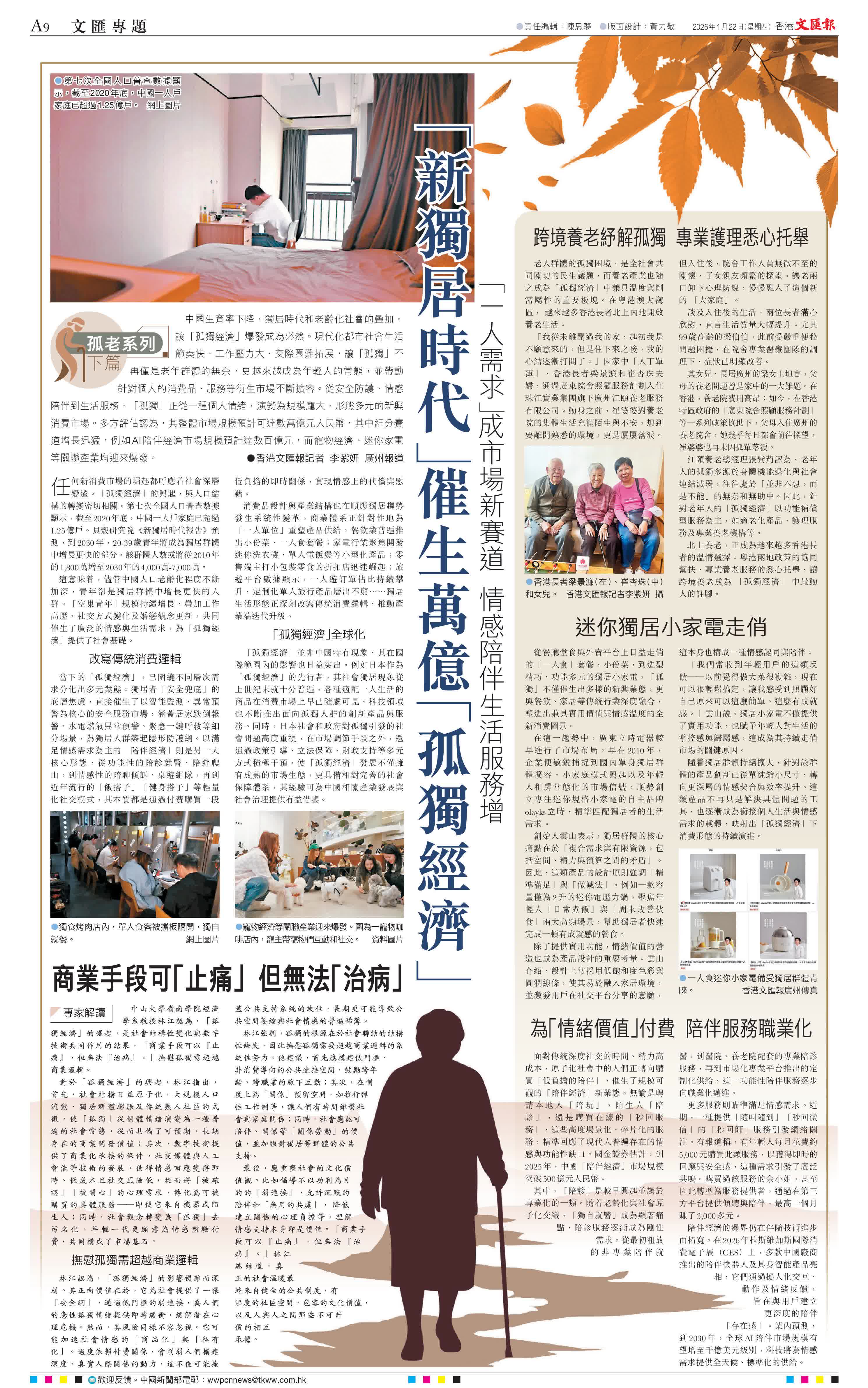 (香港文匯報記者李紫妍 廣州報道)中國生育率下降、獨居時代和老齡化社會的疊加,讓「孤獨經濟」爆發成為必然。現代化都市社會生活節奏快、工作壓力大、交際圈難拓展,讓「孤獨」不再僅是老年群體的無奈,更越來越成為年輕人的常態,並帶動針對個人的消費品、服務等衍生市場不斷擴容。從安全防護、情感陪伴到生活服務,「孤獨」正從一種個人情緒,演變為規模龐大、形態多元的新興消費市場。多方評估認為,其整體市場規模預計可達數萬億元人民幣,其中細分賽道增長迅猛,例如AI陪伴經濟市場規模預計達數百億元,而寵物經濟、迷你家電等關聯產業均迎來爆發。