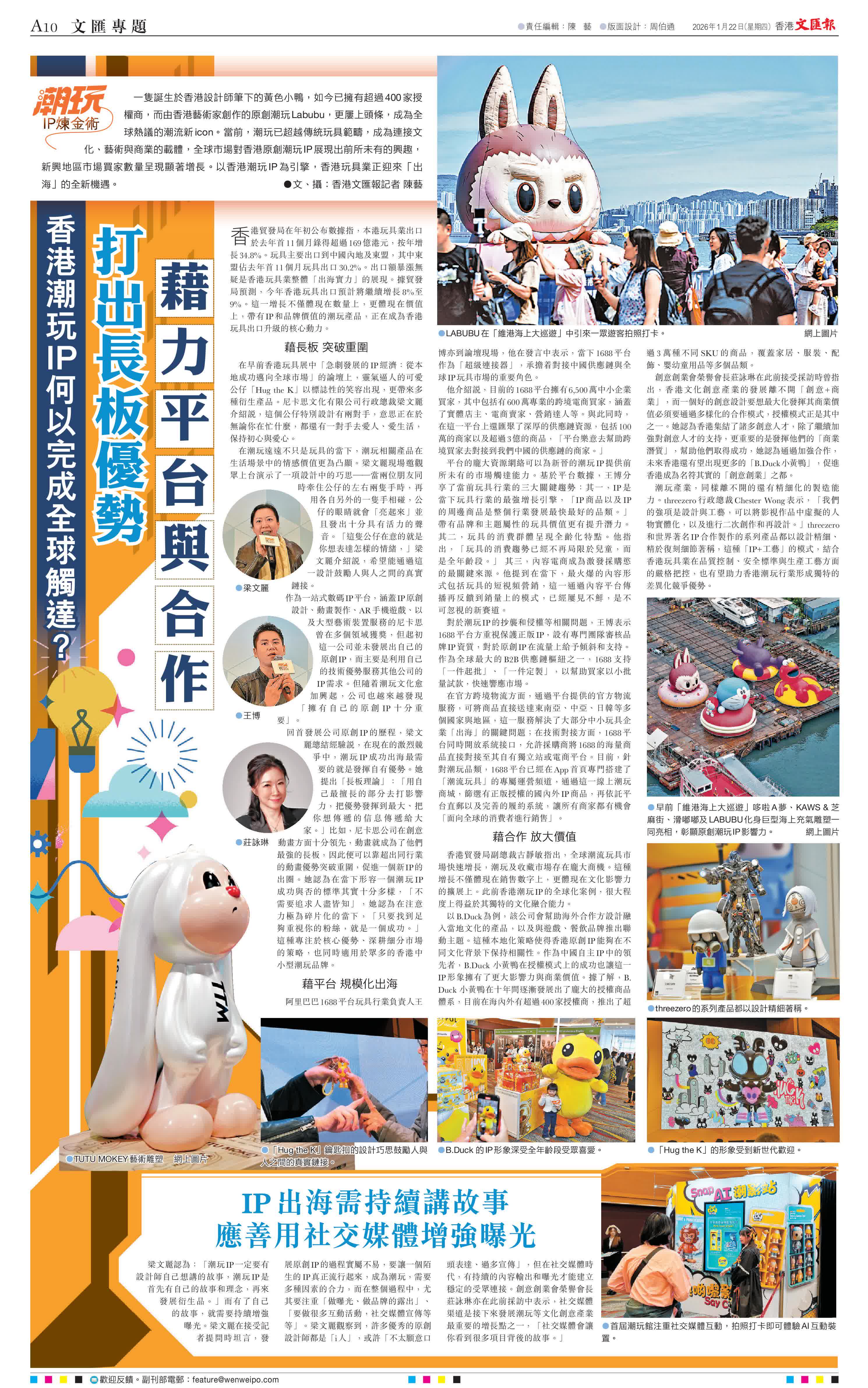 (香港文匯報記者 陳藝)一隻誕生於香港設計師筆下的黃色小鴨,如今已擁有超過400家授權商,而由香港藝術家創作的原創潮玩Labubu,更屢上頭條,成為全球熱議的潮流新icon。當前,潮玩已超越傳統玩具範疇,成為連接文化、藝術與商業的載體,全球市場對香港原創潮玩IP展現出前所未有的興趣,新興地區市場買家數量呈現顯著增長。以香港潮玩IP為引擎,香港玩具業正迎來「出海」的全新機遇。