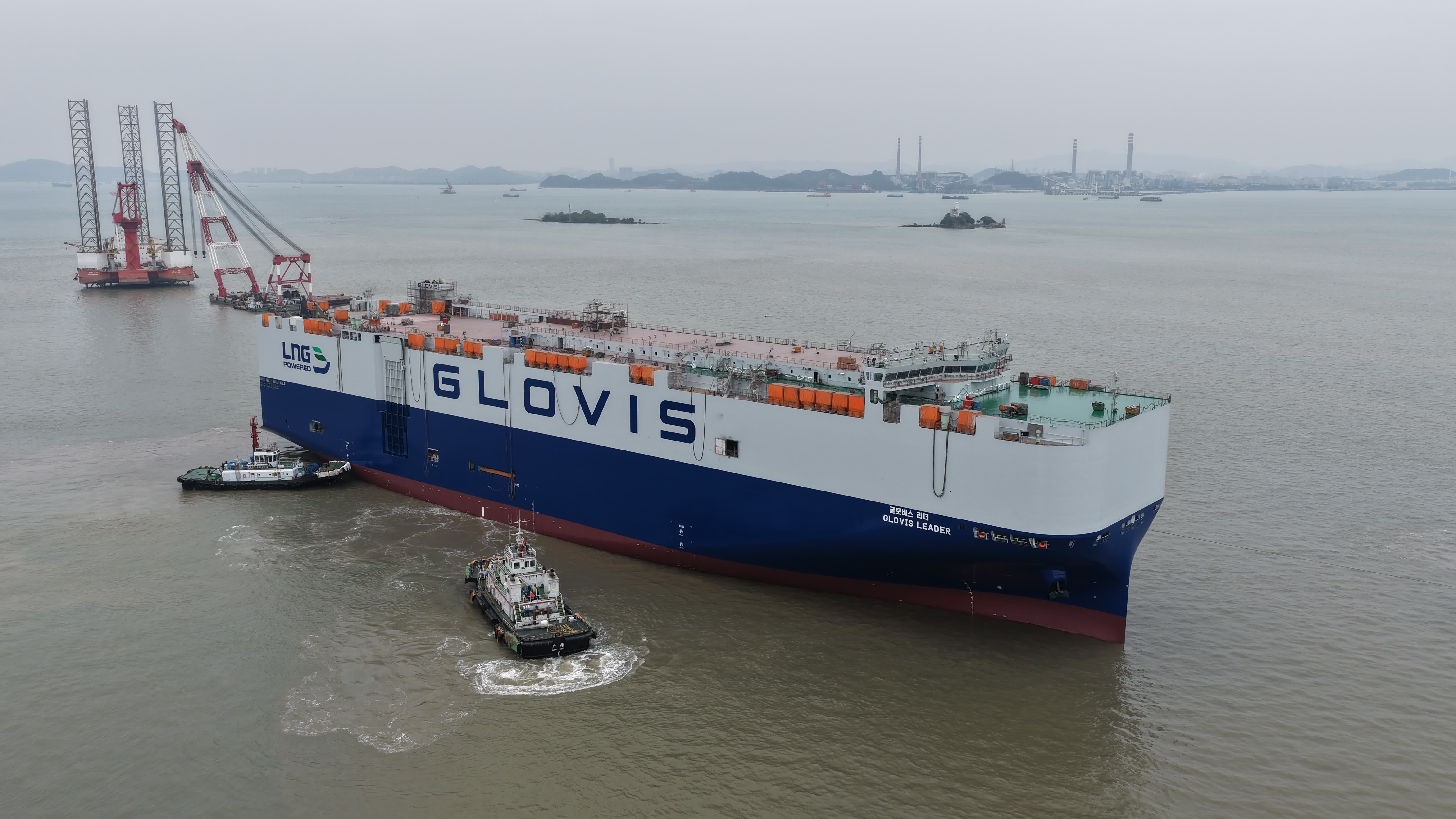 「該船採用LNG/燃油『雙燃料』動力系統,滿足國際海事組織Tier Ⅲ排放標準。船長230米、型寬40米、結構吃水10.5米,採用LNG雙燃料技術,兼顧環保與高效。」中船廣船國際相關負責人介紹,該船設有14層汽車甲板(含5層活動甲板),可靈活裝載電動汽車、氫能源汽車及重型卡車等多元貨物,單船最大載車量達10800輛,是目前中國建造的最大汽車運輸船。