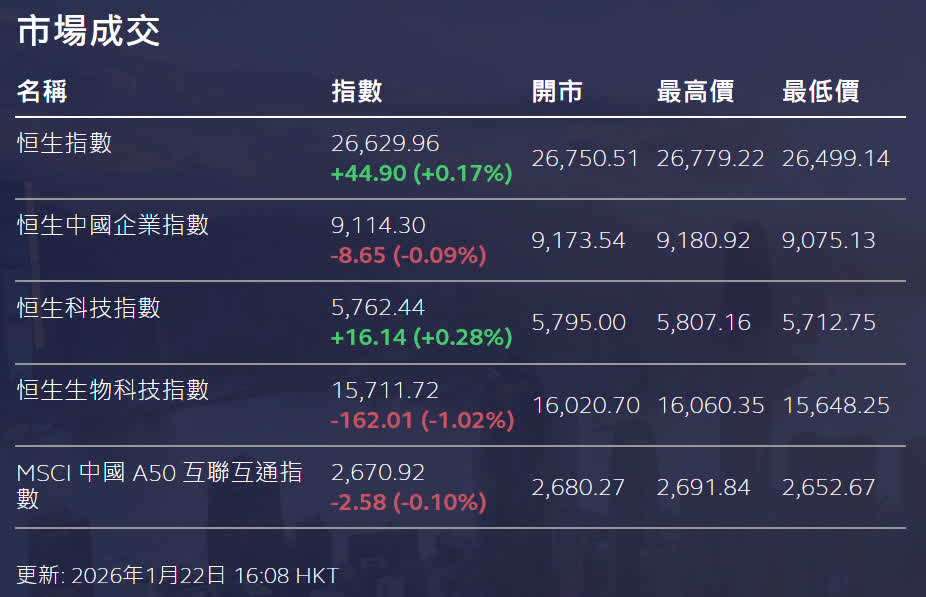 另一方面,內險股受壓,中國人壽(2628)跌3.82%,為全日跌幅最大的藍籌股。中國平安(2318)跌2.34%。此外,中國宏橋(1378)見顯著回吐,跌3.01%。
