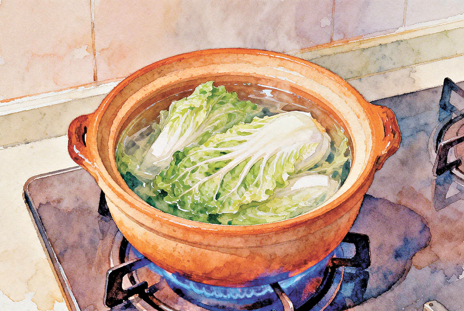 冬日的黃昏,總是來得悄然而沉靜。窗玻璃上凝着薄薄的水汽,將窗外漸濃的暮色,暈染成一片朦朧。我守在灶前,望着那隻陶土砂鍋。半棵白菜浸在清水裏,文火悠悠地煨着。火苗藍瑩瑩的,溫柔地舔着鍋底,不急不躁。