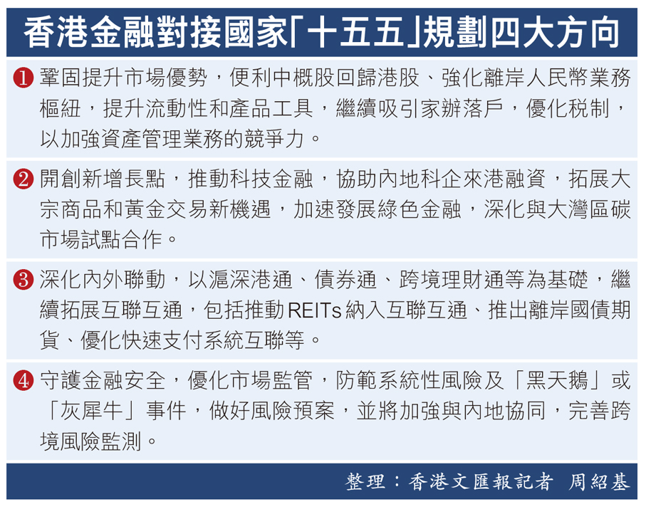 今年是國家「十五五」規劃的開局之年,面對全球地緣政治風險上升,環球經濟及金融格局重塑,新一屆立法會昨日通過「制訂香港特區發展願景,主動對接國家『十五五』規劃」議員議案,為本地經濟注入新動能,同時在新的階段為國家高質量發展及高水平對外開放貢獻香港力量。特區政府財庫局昨日指出,局方已制定中長期策略,將從4大方面推動本港金融業融入和服務國家發展大局,包括鞏固提升市場優勢、助力實體經濟高質量新增長點、深化內外聯動,以及守護金融安全。