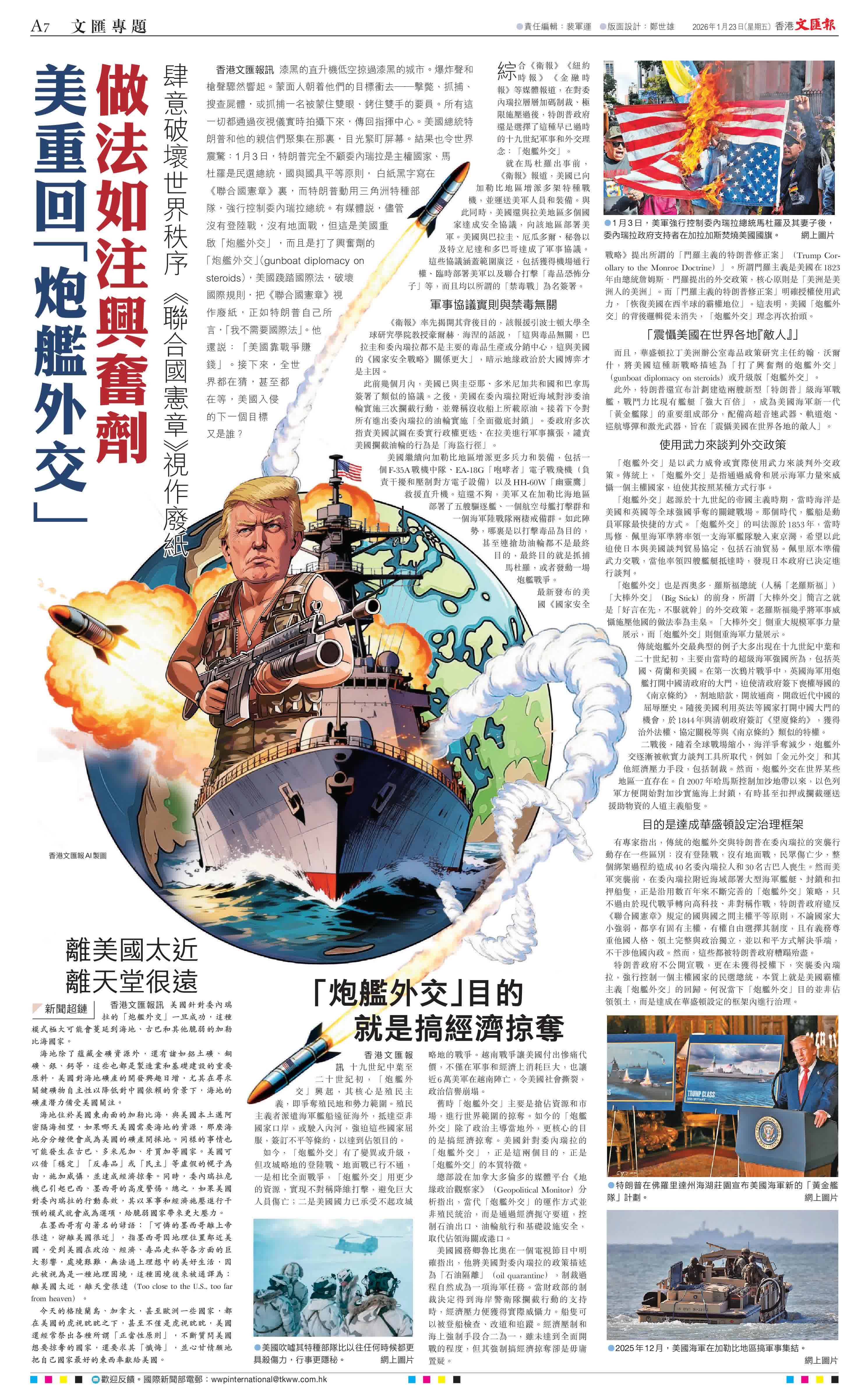 香港文匯報訊 漆黑的直升機低空掠過漆黑的城市。爆炸聲和槍聲驟然響起。蒙面人朝着他們的目標衝去——擊斃、抓捕、搜查屍體,或抓捕一名被蒙住雙眼、銬住雙手的要員。所有這一切都通過夜視儀實時拍攝下來,傳回指揮中心。美國總統特朗普和他的親信們聚集在那裏,目光緊盯屏幕。結果也令世界震驚:1月3日,特朗普完全不顧委內瑞拉是主權國家、馬杜羅是民選總統,國與國具平等原則, 白紙黑字寫在《聯合國憲章》裏,而特朗普動用三角洲特種部隊,強行控制委內瑞拉總統。有媒體說,儘管沒有登陸戰,沒有地面戰,但這是美國重啟「炮艦外交」,而且是打了興奮劑的「炮艦外交」(gunboat diplomacy on steroids),美國踐踏國際法,破壞國際規則,把《聯合國憲章》視作廢紙,正如特朗普自己所言,「我不需要國際法」。他還說:「美國靠戰爭賺錢」。接下來,全世界都在猜,甚至都在等,美國入侵的下一個目標又是誰?