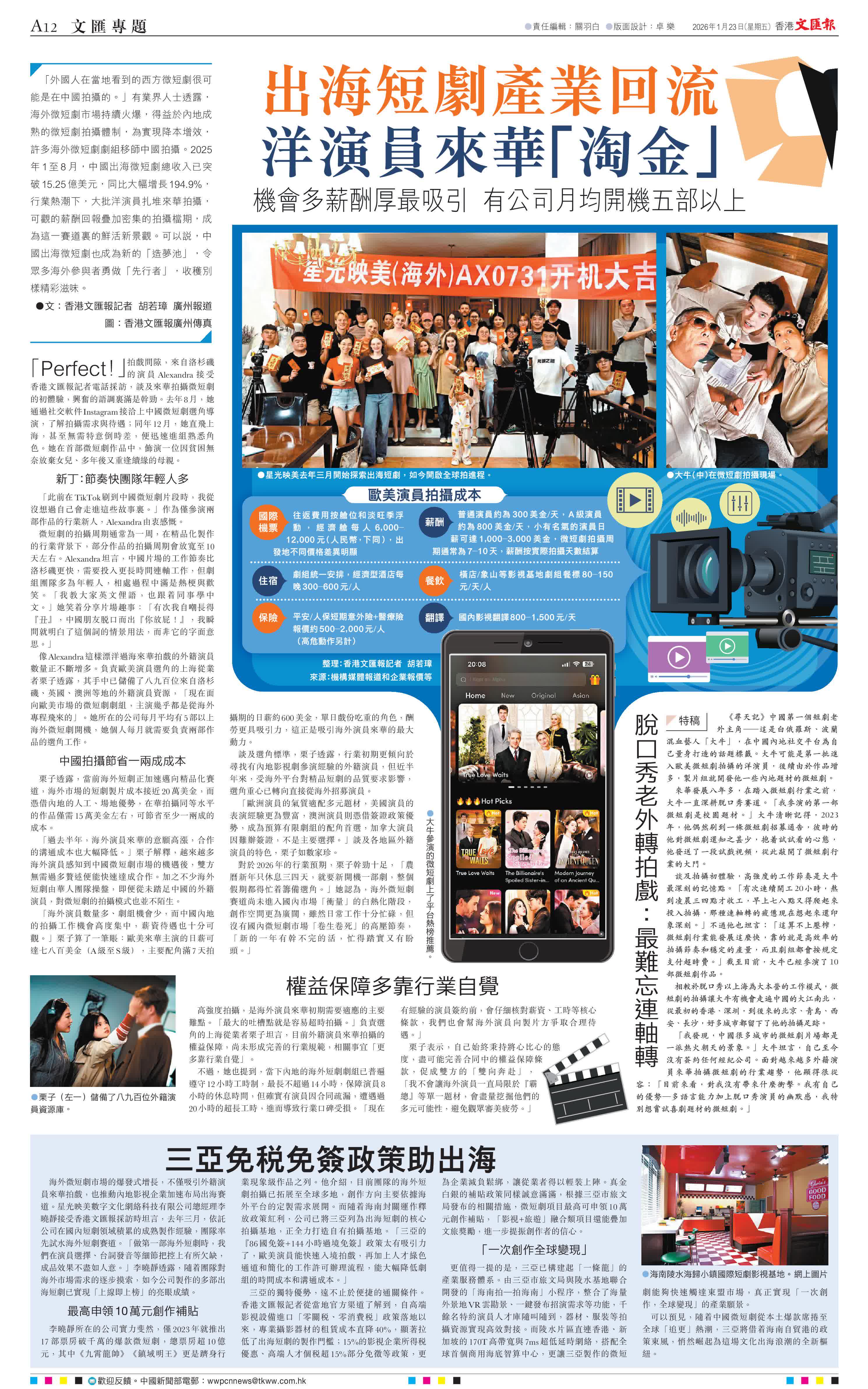 (香港文匯報記者 胡若璋 廣州報道)「外國人在當地看到的西方微短劇很可能是在中國拍攝的。」有業界人士透露,海外微短劇市場持續火爆,得益於內地成熟的微短劇拍攝體制,為實現降本增效,許多海外微短劇劇組移師中國拍攝。2025年1至8月,中國出海微短劇總收入已突破15.25億美元,同比大幅增長194.9%,行業熱潮下,大批洋演員扎堆來華拍攝,可觀的薪酬回報疊加密集的拍攝檔期,成為這一賽道裏的鮮活新景觀。可以說,中國出海微短劇也成為新的「造夢池」,令眾多海外參與者勇做「先行者」,收穫別樣精彩滋味。
