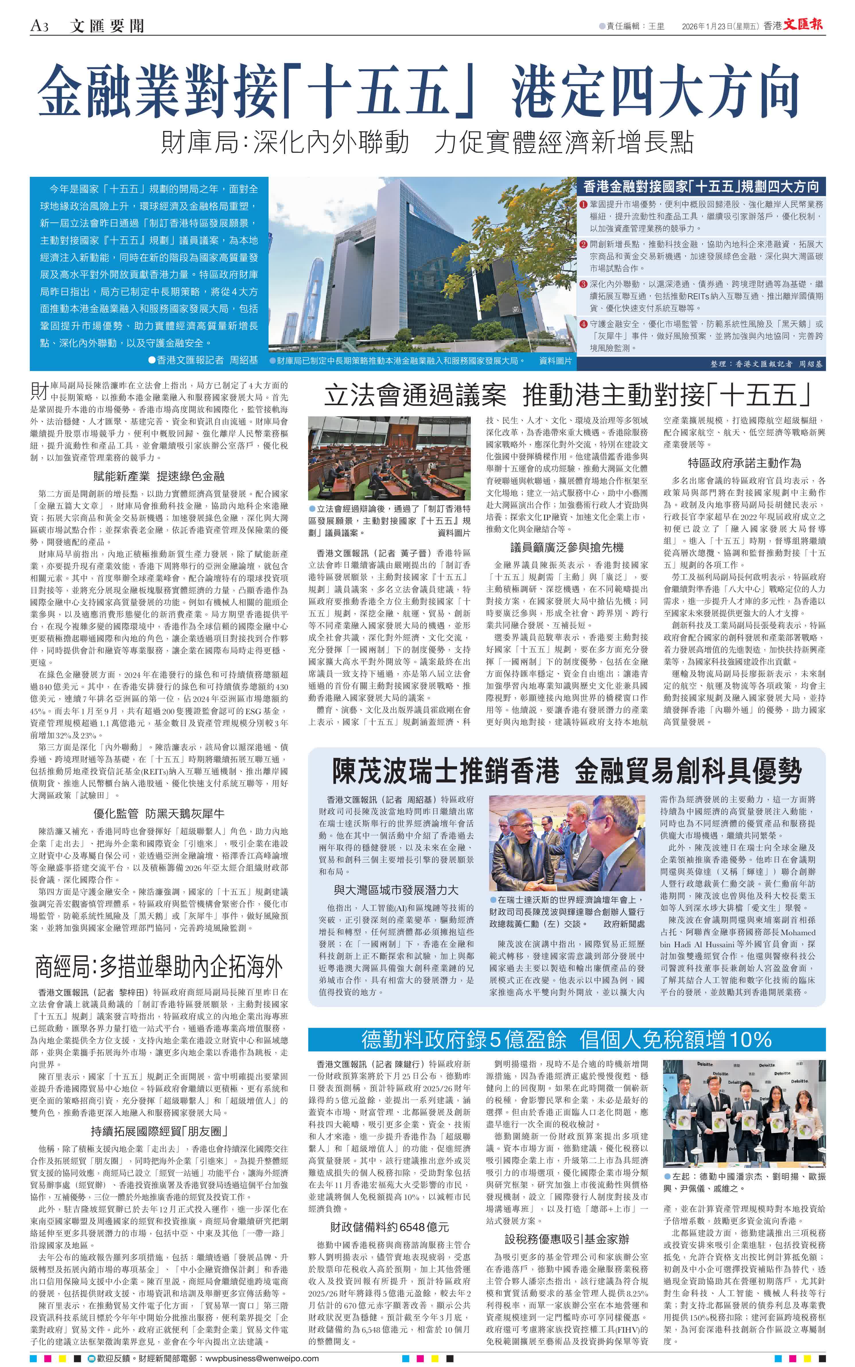 (香港文匯報記者 周紹基)今年是國家「十五五」規劃的開局之年,面對全球地緣政治風險上升,環球經濟及金融格局重塑,新一屆立法會昨日通過「制訂香港特區發展願景,主動對接國家『十五五』規劃」議員議案,為本地經濟注入新動能,同時在新的階段為國家高質量發展及高水平對外開放貢獻香港力量。特區政府財庫局昨日指出,局方已制定中長期策略,將從4大方面推動本港金融業融入和服務國家發展大局,包括鞏固提升市場優勢、助力實體經濟高質量新增長點、深化內外聯動,以及守護金融安全。