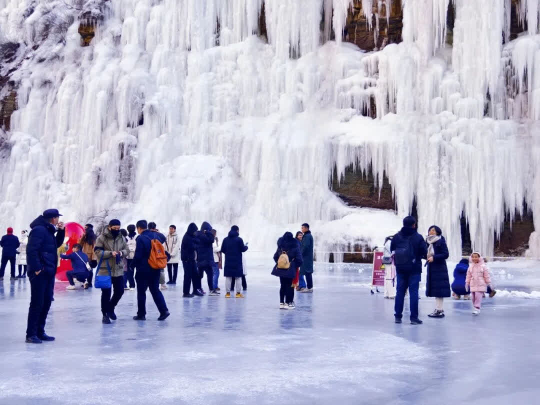 走進長治平順的通天峽景區,碧綠的冰面布滿天然裂紋,巨大的白色冰瀑直掛山崖,木質棧道在冰柱間延伸,遊客可在冰面上行走嬉戲,或沿棧道登高觀景。