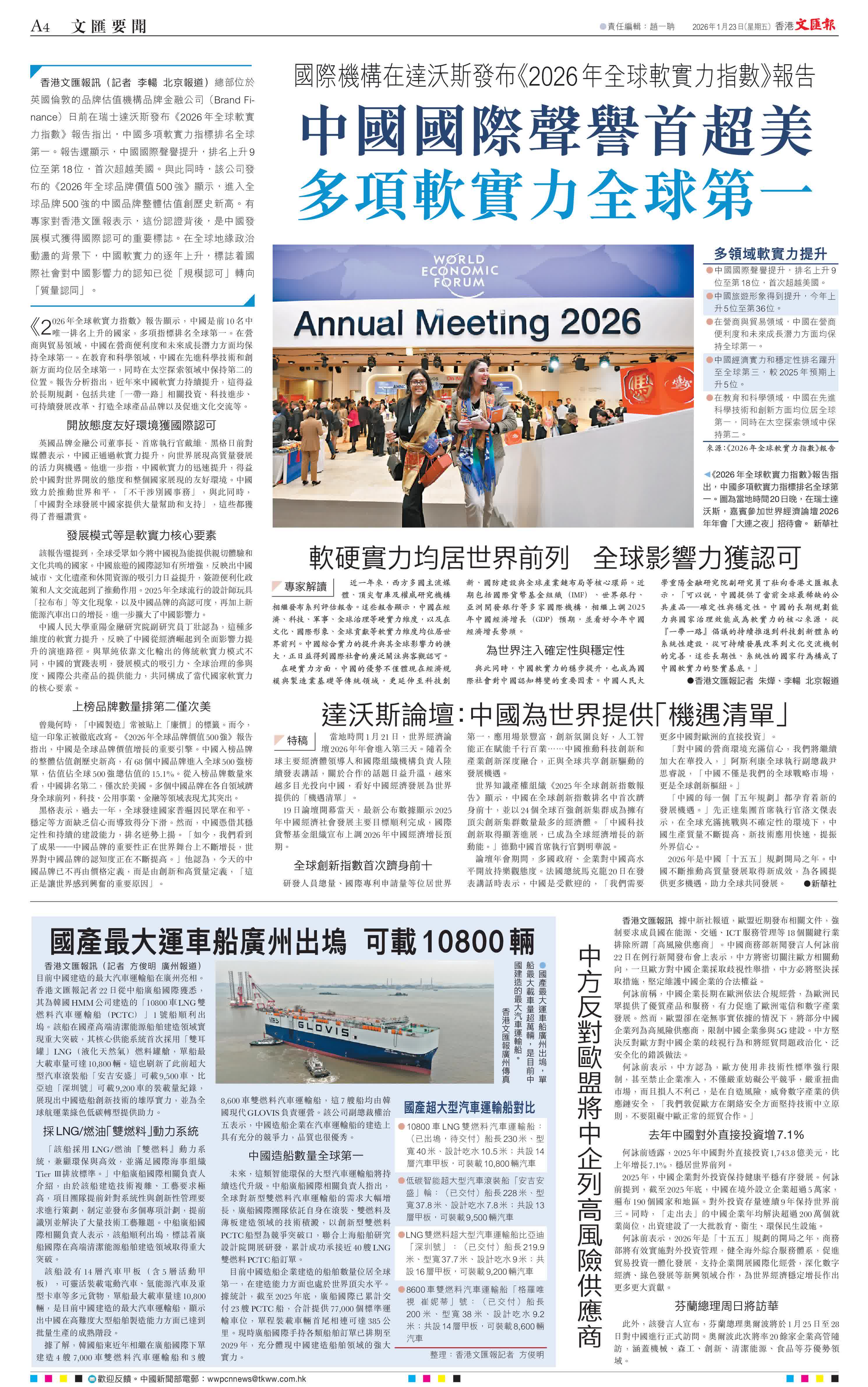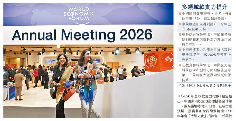 香港文匯報訊(記者 李暢 北京報道)總部位於英國倫敦的品牌估值機構品牌金融公司(Brand Finance)日前在瑞士達沃斯發布《2026年全球軟實力指數》報告指出,中國多項軟實力指標排名全球第一。報告還顯示,中國國際聲譽提升,排名上升9位至第18位,首次超越美國。與此同時,該公司發布的《2026年全球品牌價值500強》顯示,進入全球品牌500強的中國品牌整體估值創歷史新高。有專家對香港文匯報表示,這份認證背後,是中國發展模式獲得國際認可的重要標誌。在全球地緣政治動盪的背景下,中國軟實力的逐年上升,標誌着國際社會對中國影響力的認知已從「規模認可」轉向「質量認同」。