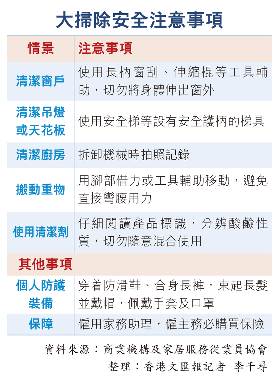 香港文匯報訊(記者 李千尋)農曆新年將至,市民陸續開始大掃除,為送舊迎新作好準備。不過,在清潔過程中潛藏不少安全隱患。商業機構及家居服務從業員協會昨日提醒,市民及從業員在進行窗戶或高處清潔時,須格外留意人身安全,避免意外失足墜落;使用清潔劑不可胡亂混合,以免釋放有毒氣體。協會表示,大掃除服務搶手,自去年12月起已陸續有僱主查詢預約,家務助理時薪介乎140元至180元,並建議政府加強支援,提供進階培訓課程,提升從業員專業水平。